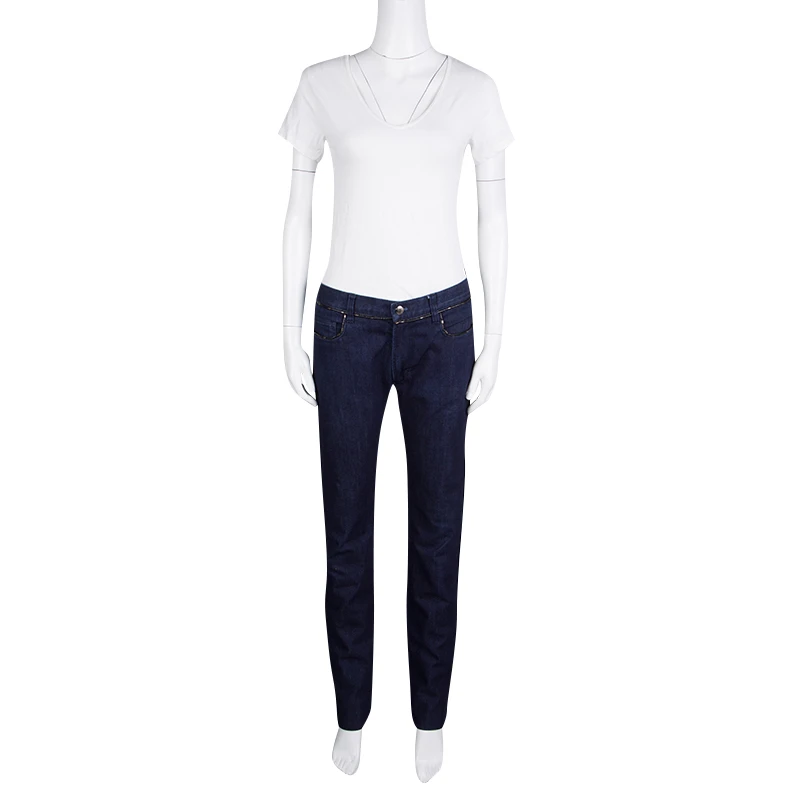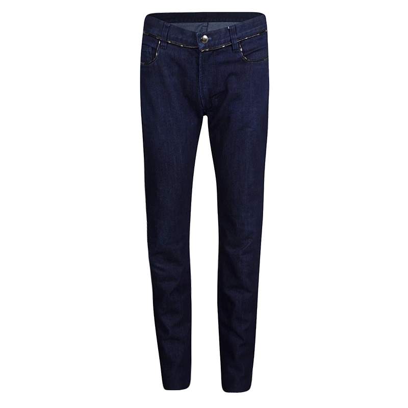 You can now dress in the most casual manner by coupling this Versace denim with any sexy tunic. It is structured to offer skinny pattern with a dark wash and broad waistline making it comfortable to wear. The waistband is finely stitched with simple metal button, a zip fly and dual pockets at the backside. Tuck a tailored shirt into these straight fit jeans and pair with metallic heels for a contemporary take on work wear.