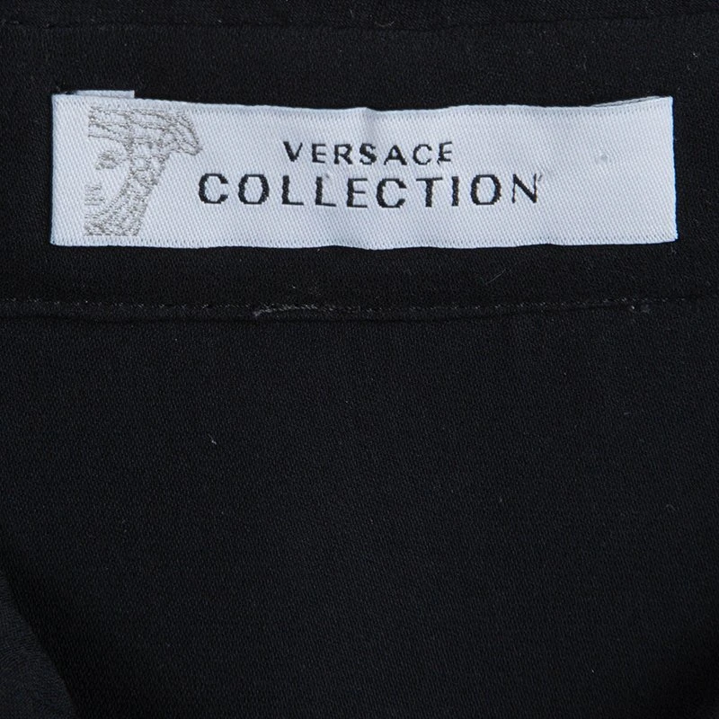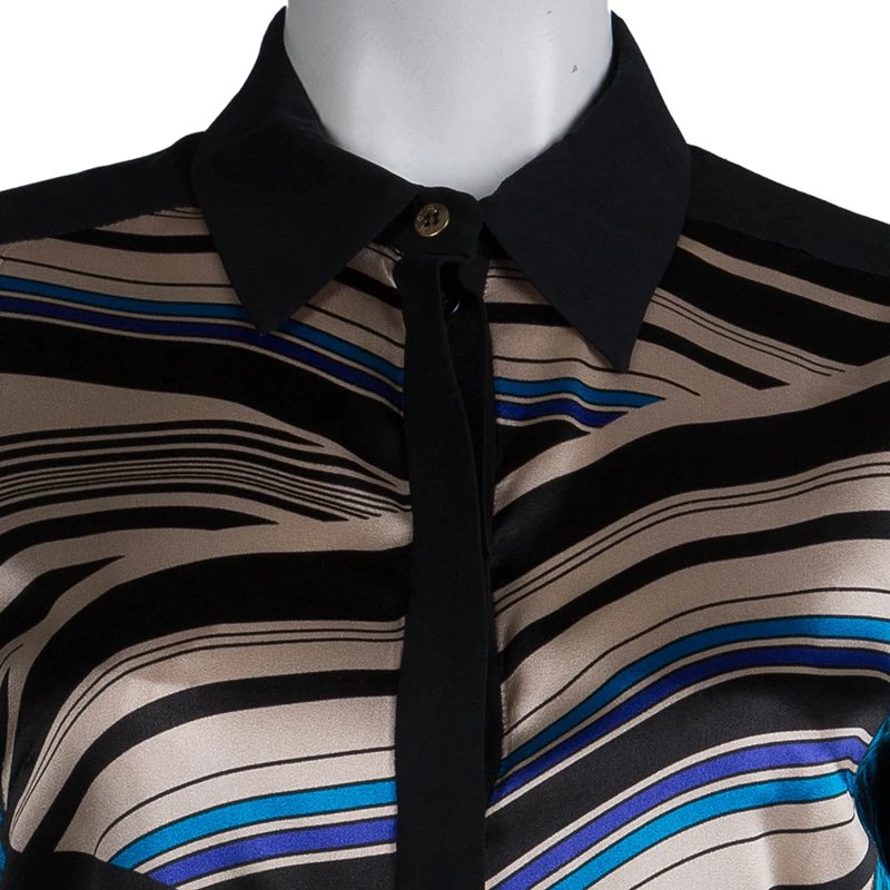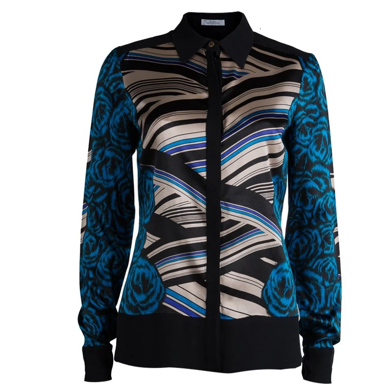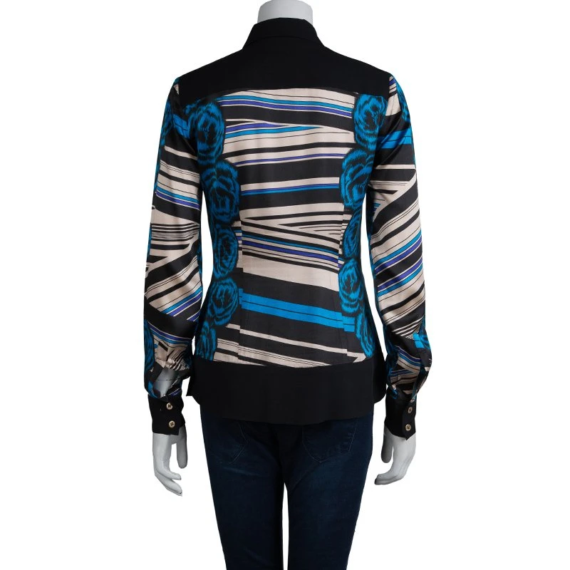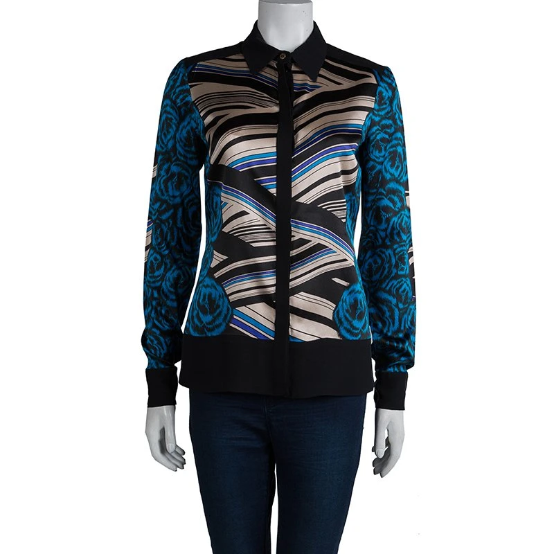 The Versace collection multicolour shirt is a splash of colour with diagonals on the body and a large blue rose print on the sleeves and sides. The black collar, button placket, yoke and cuffs stand in sharp contrast to the swirls of colour. This silk shirt is definitely for someone looking for designer wear.