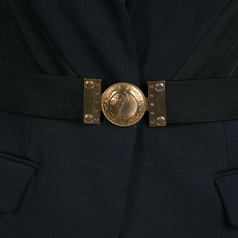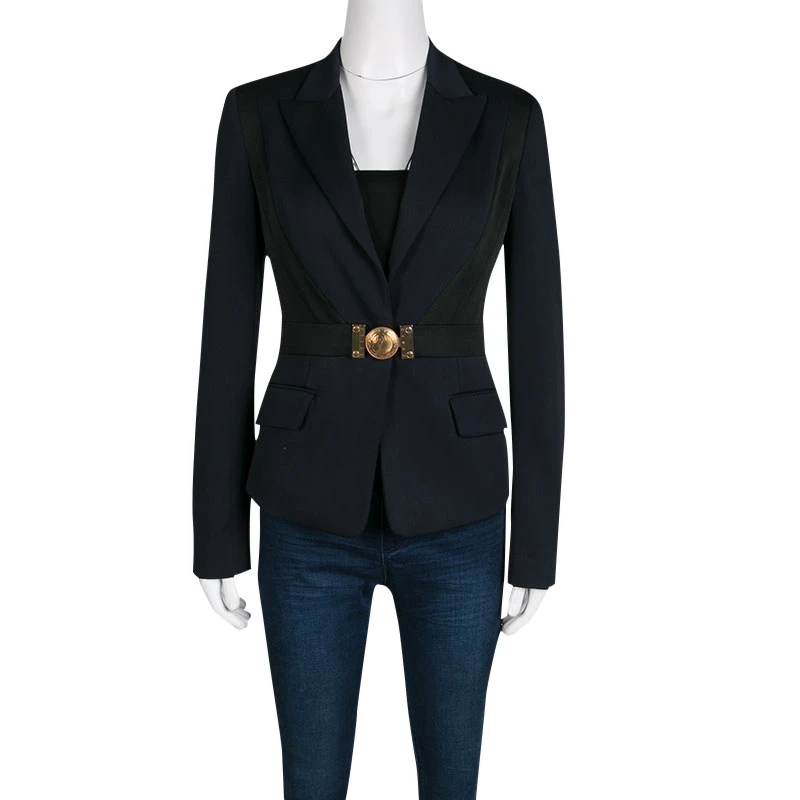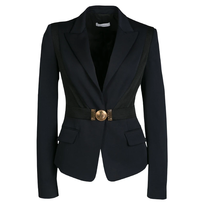 A piece of clothing that can effortlessly enhance your formal outfits, this blazer by Versace Collection is styled in black colour into a slim-fitting structure. Designed with ribbed panels on the front and a belt accented with a chunky buckle, the blazer is equipped with two flap pockets, long sleeves, and notched lapels. Style this with your statement separates.