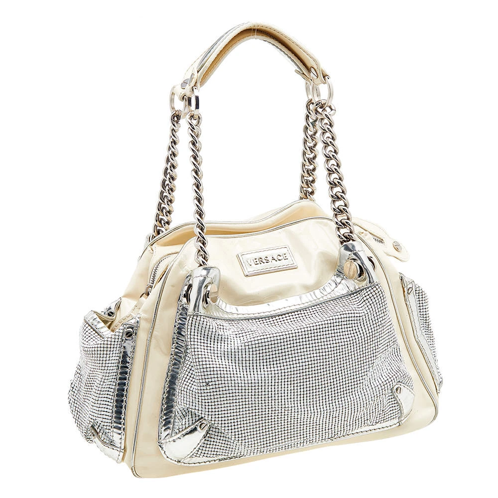 Versace handbags are known for their unique designs that emanate the label’s feminine verve and immaculate craftsmanship so that they last season after season. Crafted from cream patent leather, the satchel is elevated with metallic mesh and the brand plaque at the front.
