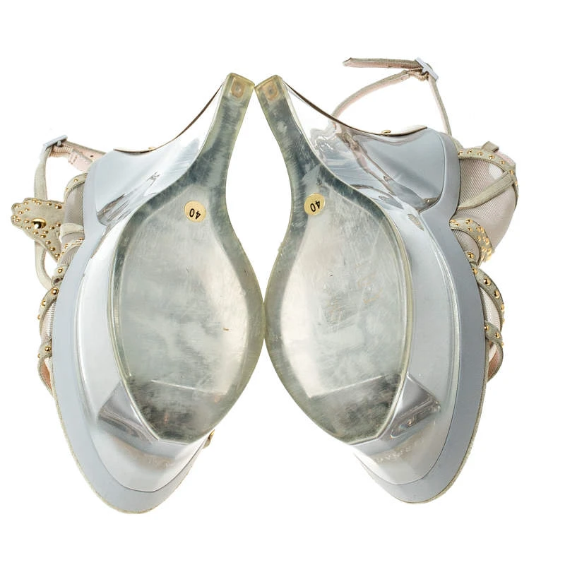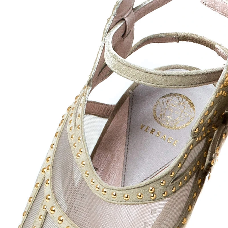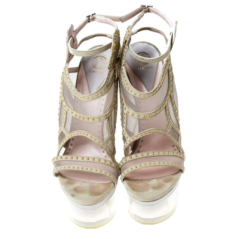 Stand out and make a statement at the parties while wearing these stunning Versace wedge sandals. Constructed in the most stunning cream embellished suede, this pair features cutout straps at the front and ankles with buckle fastenings for a chic and elegant look. The fun wedge heels give the pair its finishing look.