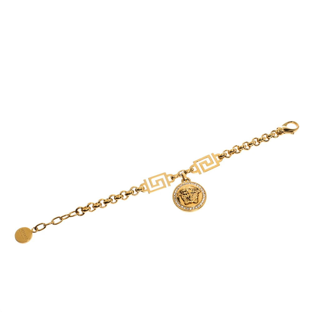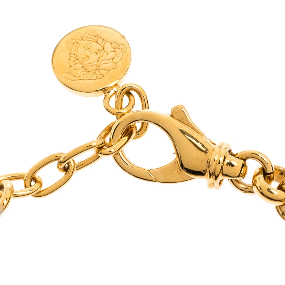 Accessorize your bold looks with this engaging and striking bracelet from Versace. The smart piece is crafted from gold-tone metal and features the brand’s signature Medusa medallion charm as well as the signature logo as links. It comes with a chunky interlocking chain and a lobster clasp. Wear this exquisite creation with your evening ensemble.