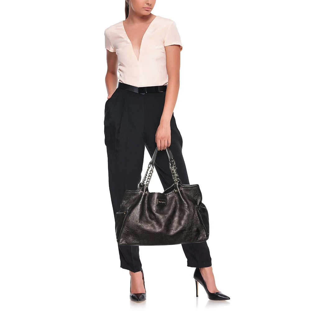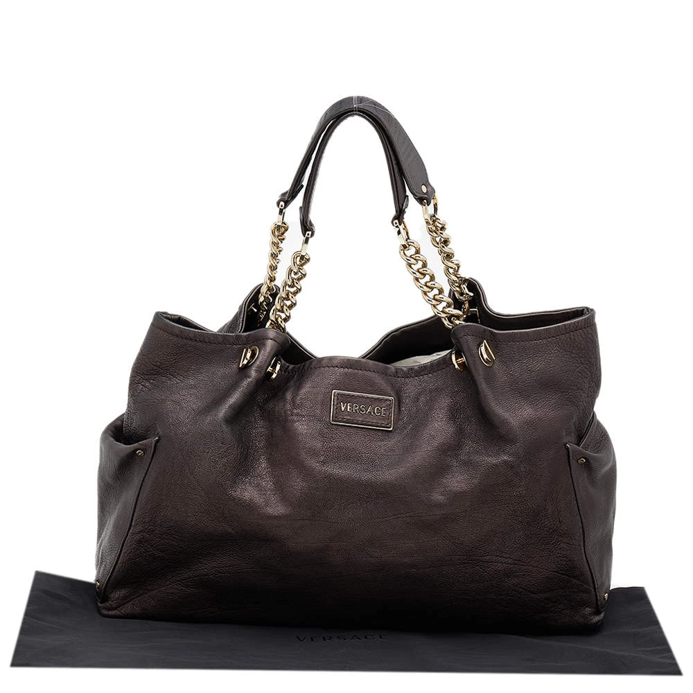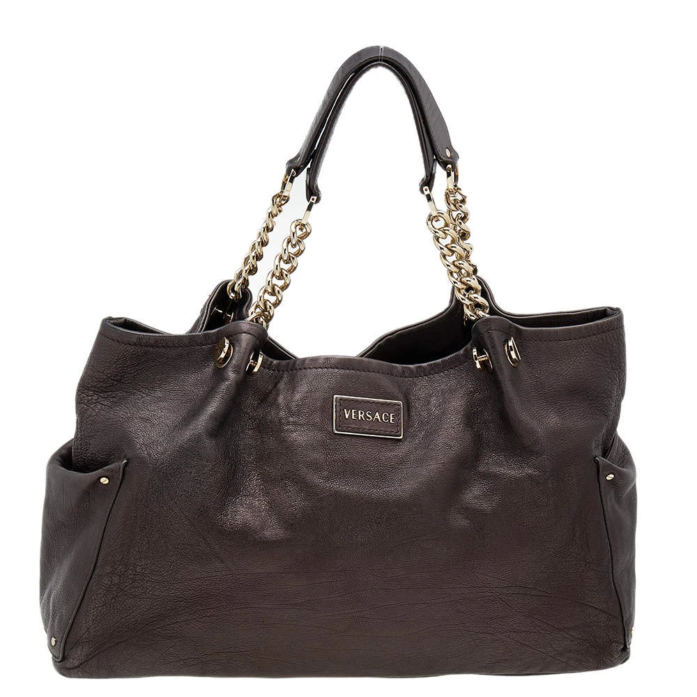 This Versace tote is a simple and elegant accessory. From its design to its structure, the leather bag delivers charm and function. It flaunts chainlink handles for you to swing and a satin interior to hold all your essentials.