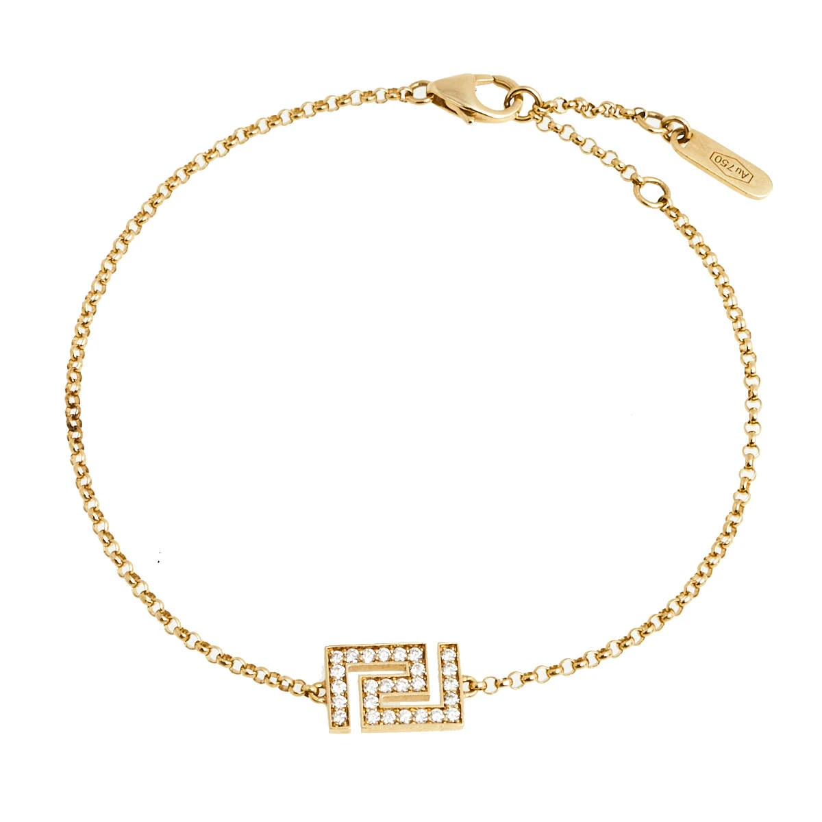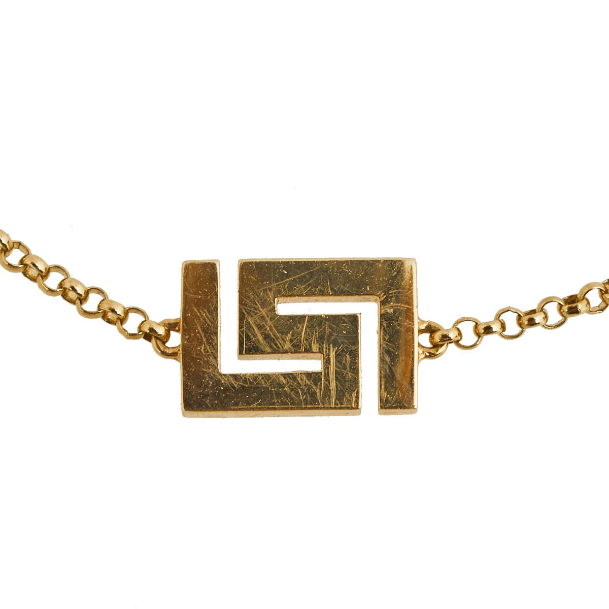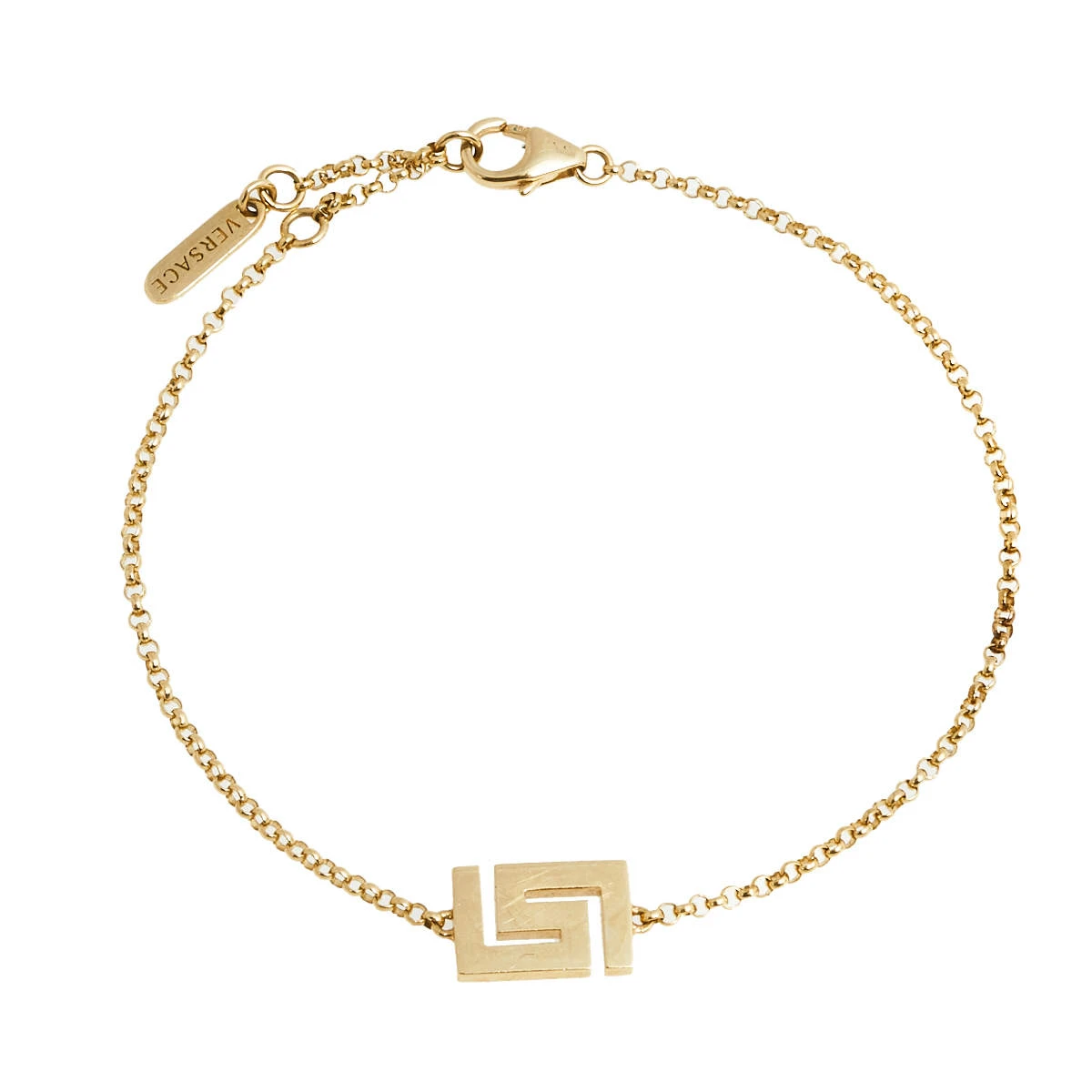 Artfully made from 18k yellow gold, this flawless bracelet by Versace can be your next prized possession. Featuring a gorgeous signature Greek key charm studded with diamonds, the design has been finished with a lobster clasp on the chain. The piece is simple and grand.