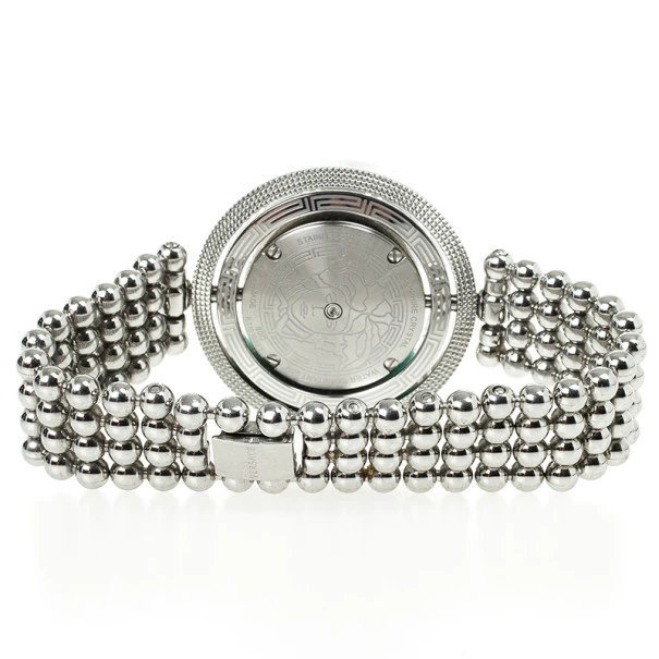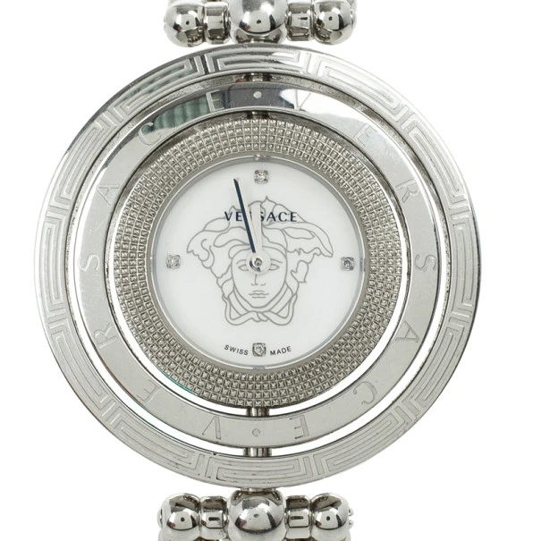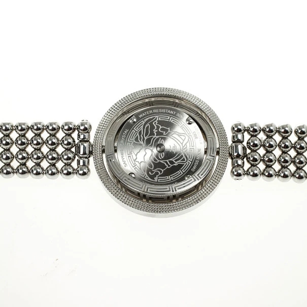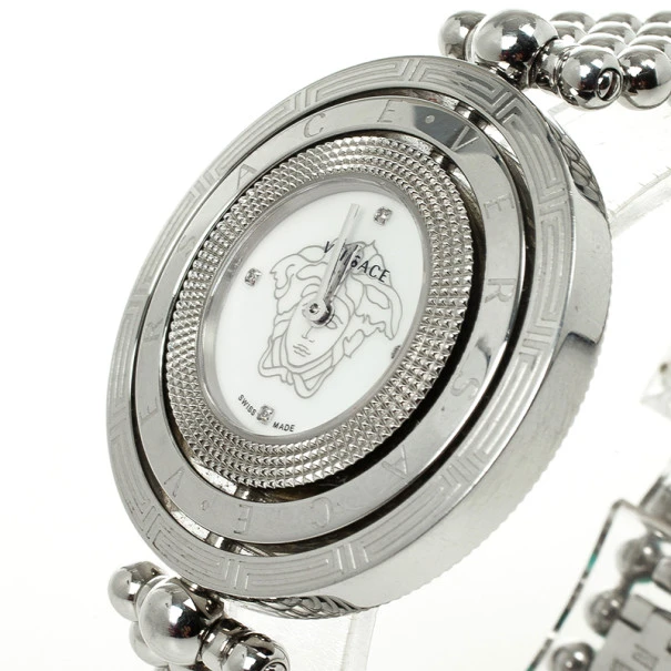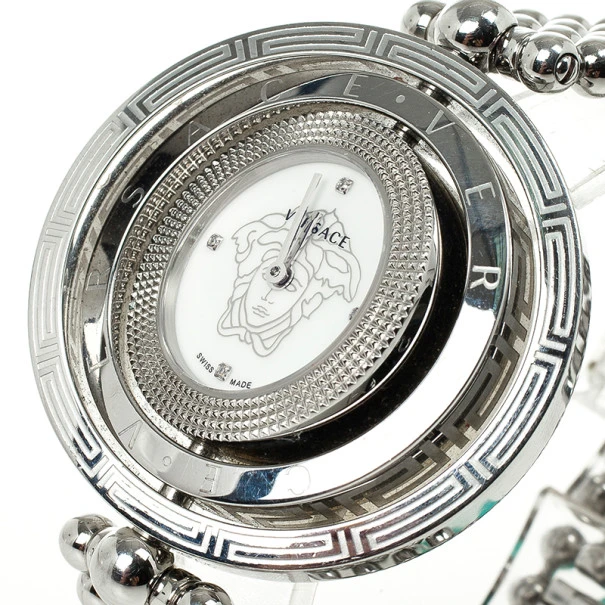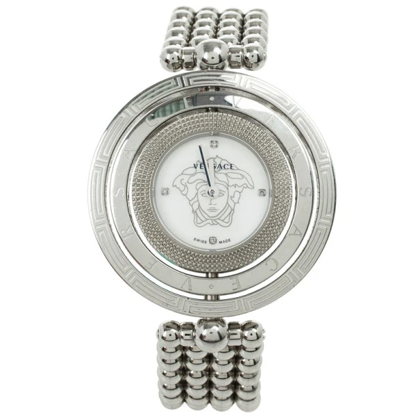 This sublime Versace Eon Stainless Steel Womens Wristwatch features a fabulous rotating outer ring. It is made from stainless steel, it features a white dial and the Versace logo. The chain link stainless steel bracelet fixes on the wrist with a clasp closure. Original Retail Price: US $1,279