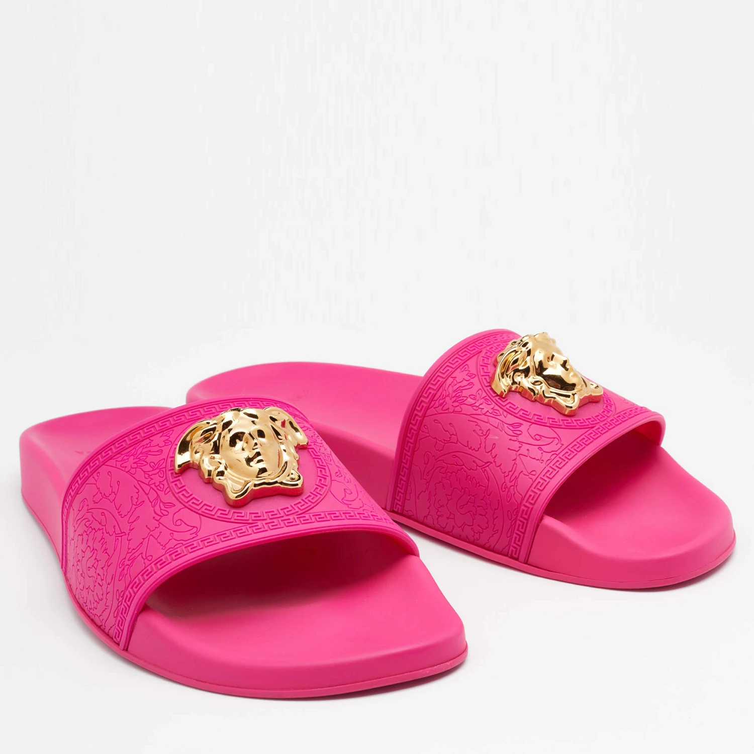 Versace understands your need for comfort and style in these slides. The flats are crafted in Italy and made from water-resistant rubber. They are styled with open toes, broad front straps with the Medusa logo for a signature finish.