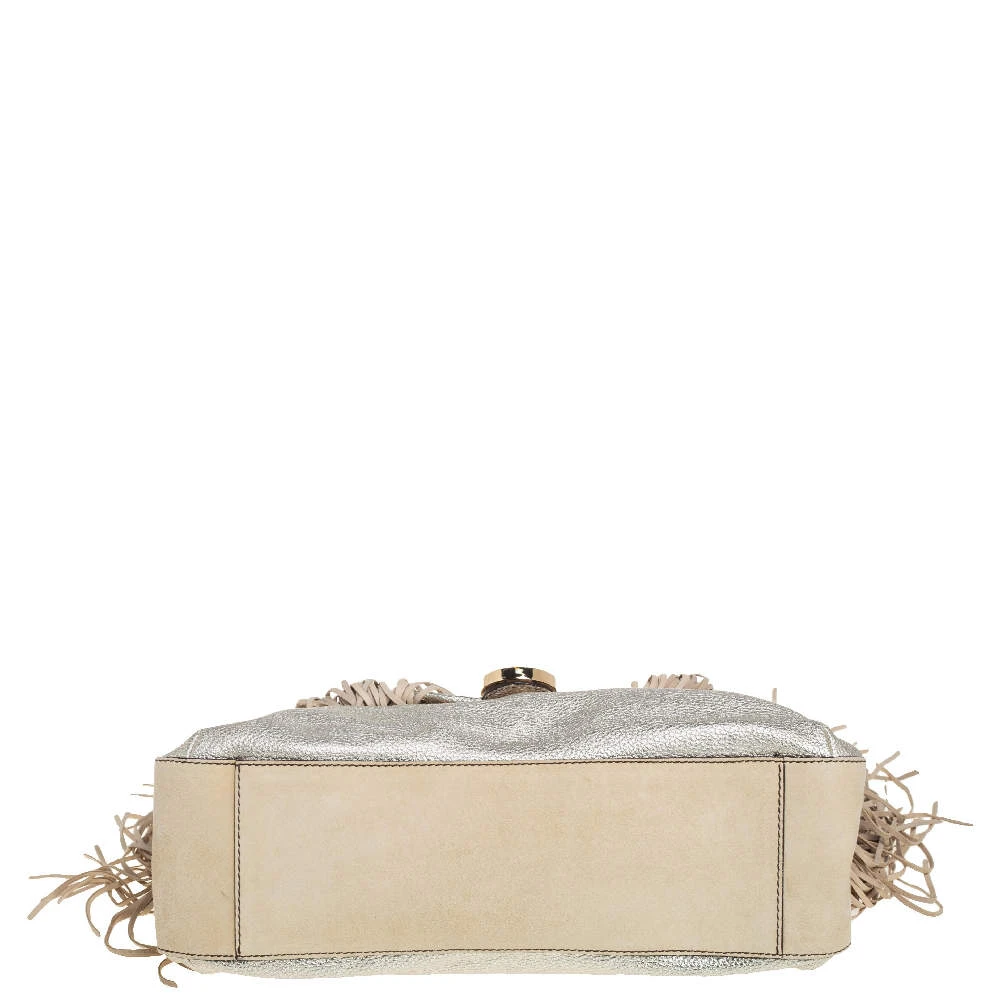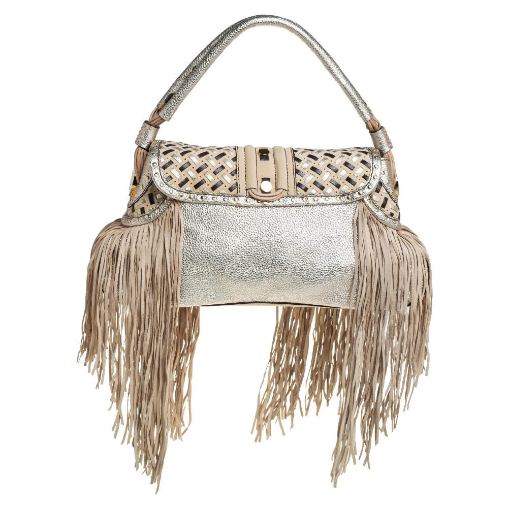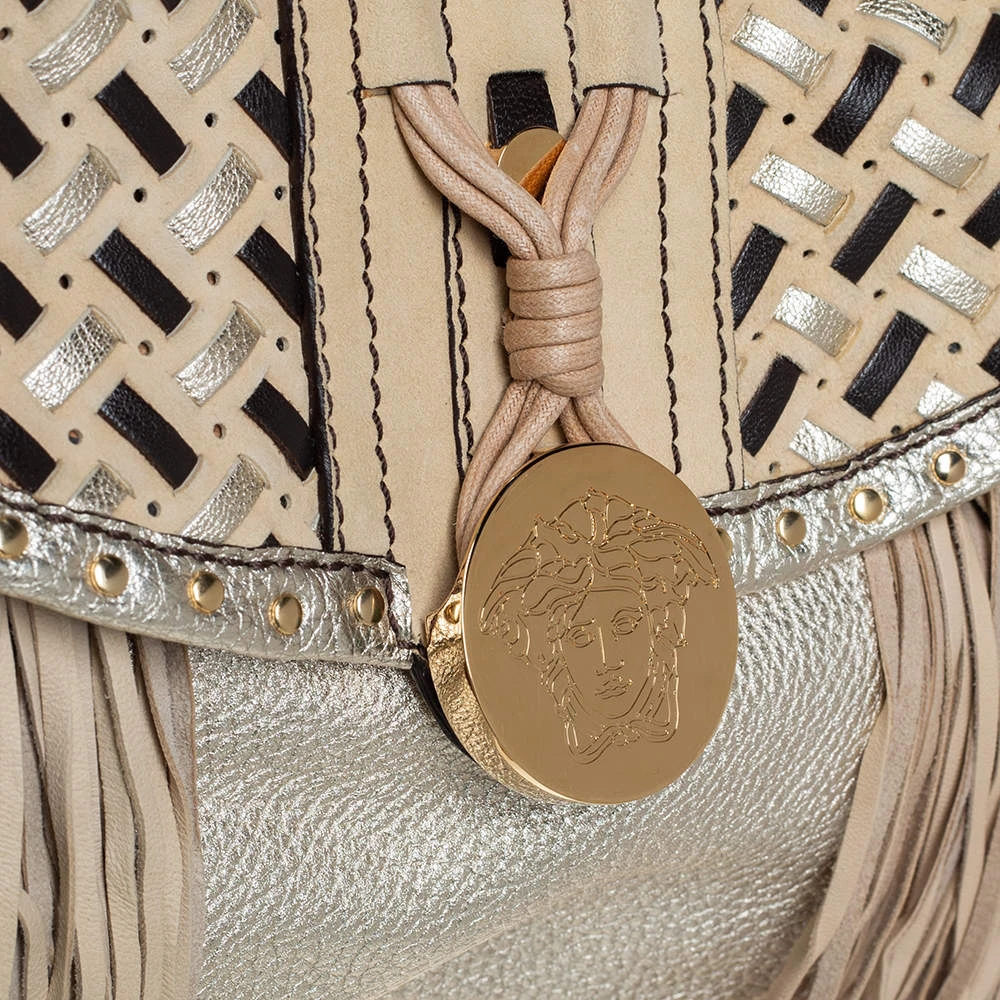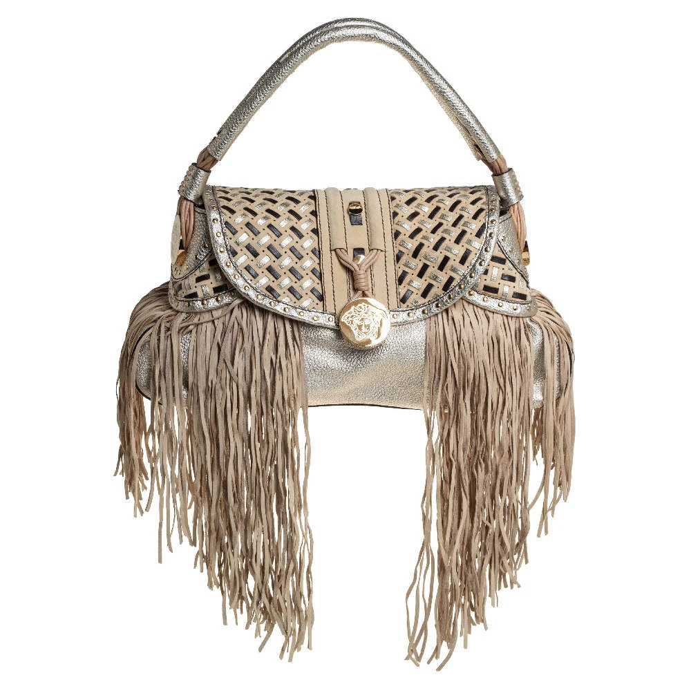 When utility meets high style, we get this Versace bag. Crafted from woven leather, this bag features a top handle, the Medusa logo charm on the embellished front flap, heavy fringes on the exterior, and a satin interior to house the things you need.