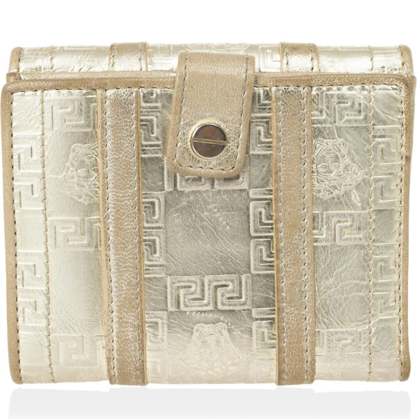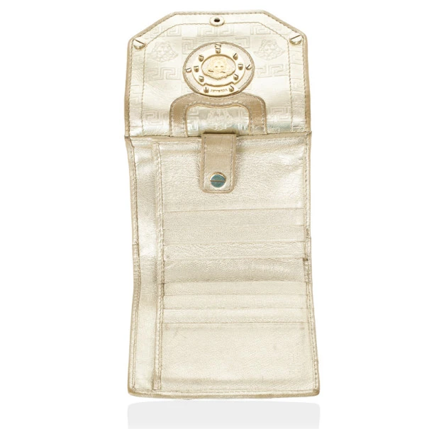 Stash your bills in this luxurious leather wallet by Versace. Made from embossed leather, this wallet is accented with gold toned Versace Medusa and screws. The exterior has one flap pocket with snap fastening. The interior is lined with leather and has six slots and two compartments. Original Retail Price: US $635