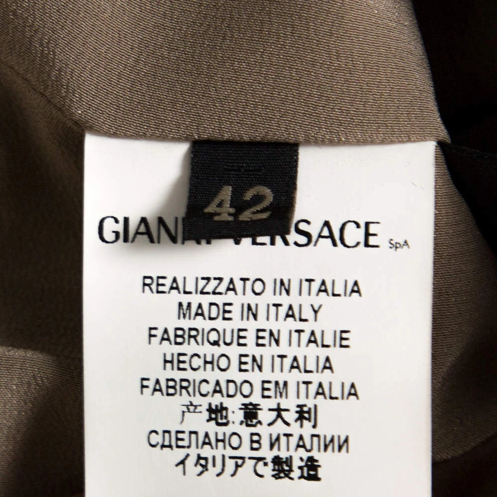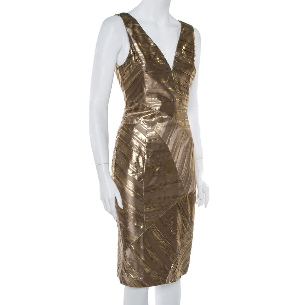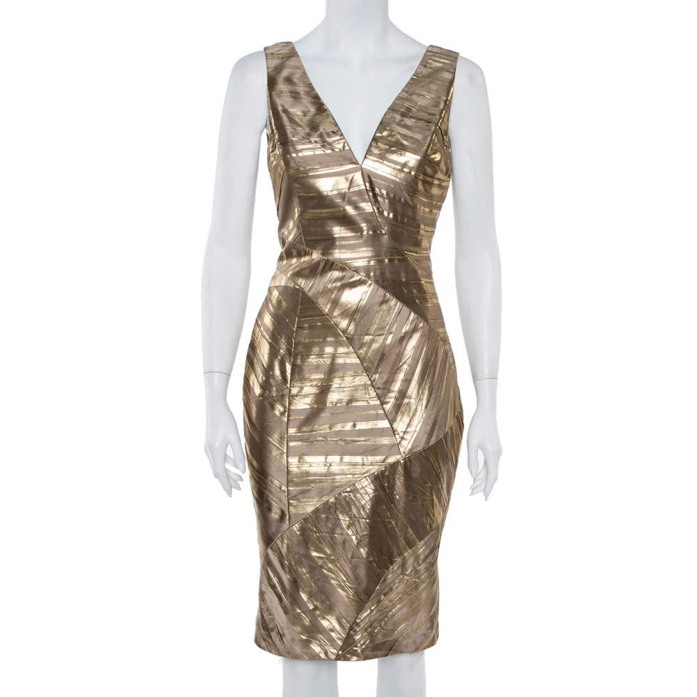 Be at your glamorous best in this sleeveless dress from the house of Versace! The gold creation is made of 100% silk and has been styled with a foil print. Exhibiting a flattering silhouette, it comes with a deep V-neckline and a concealed zip closure at the back. It will look amazing with pointed pumps and an embellished clutch.