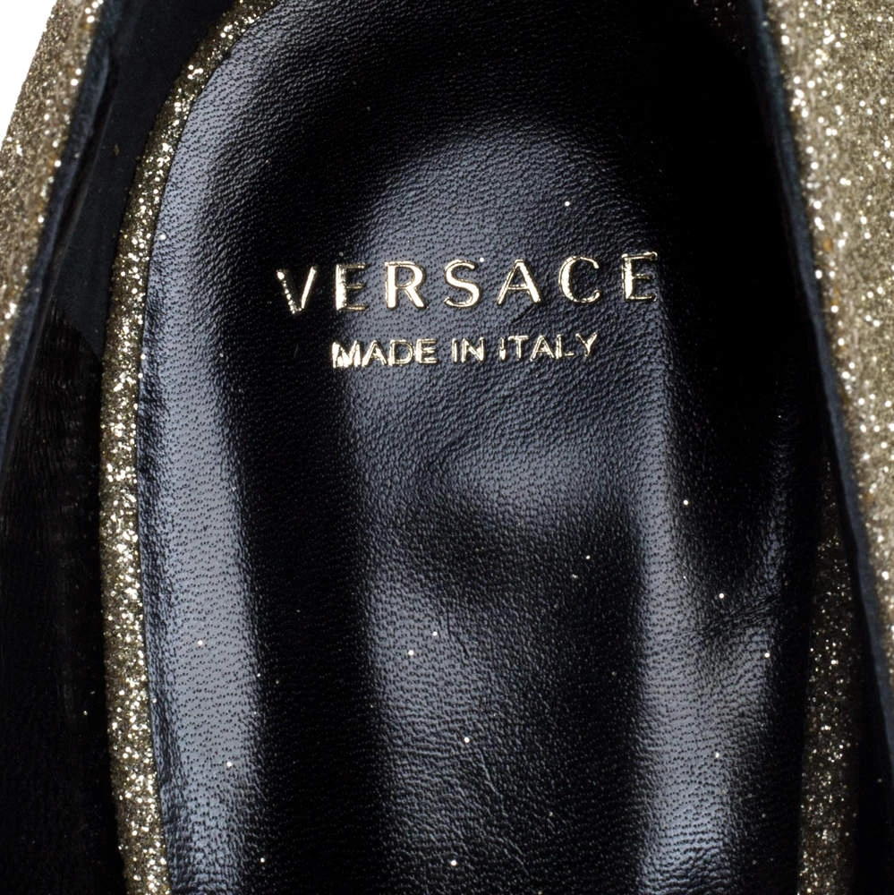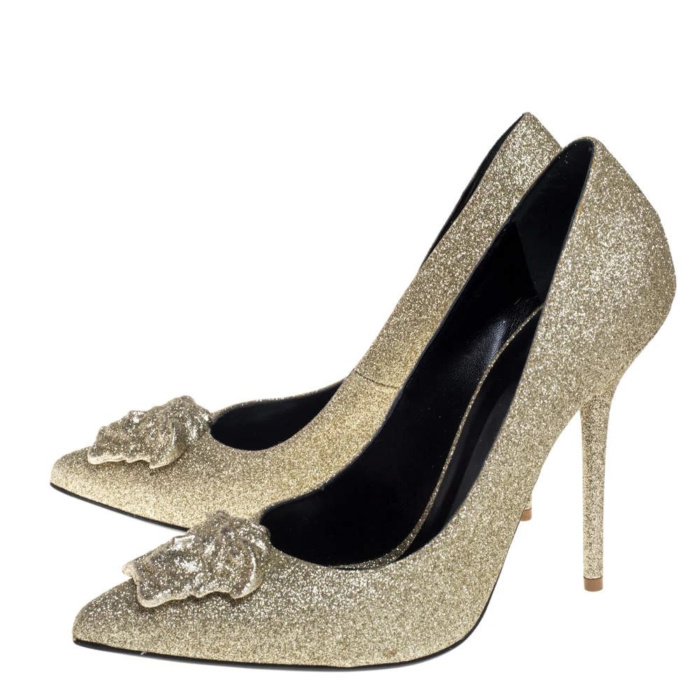 Be ready for constant attention and admirable gasps from your audience when you walk in these pumps from Versace. Crafted from gold glitter fabric, they carry pointed toes with the iconic Medusa logo embellished on them and 10 cm stiletto heels. The pair is complete with comfortable leather-lined insoles.