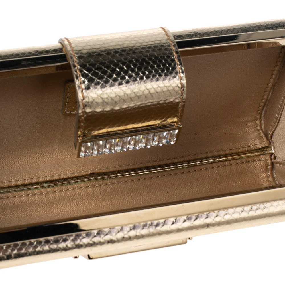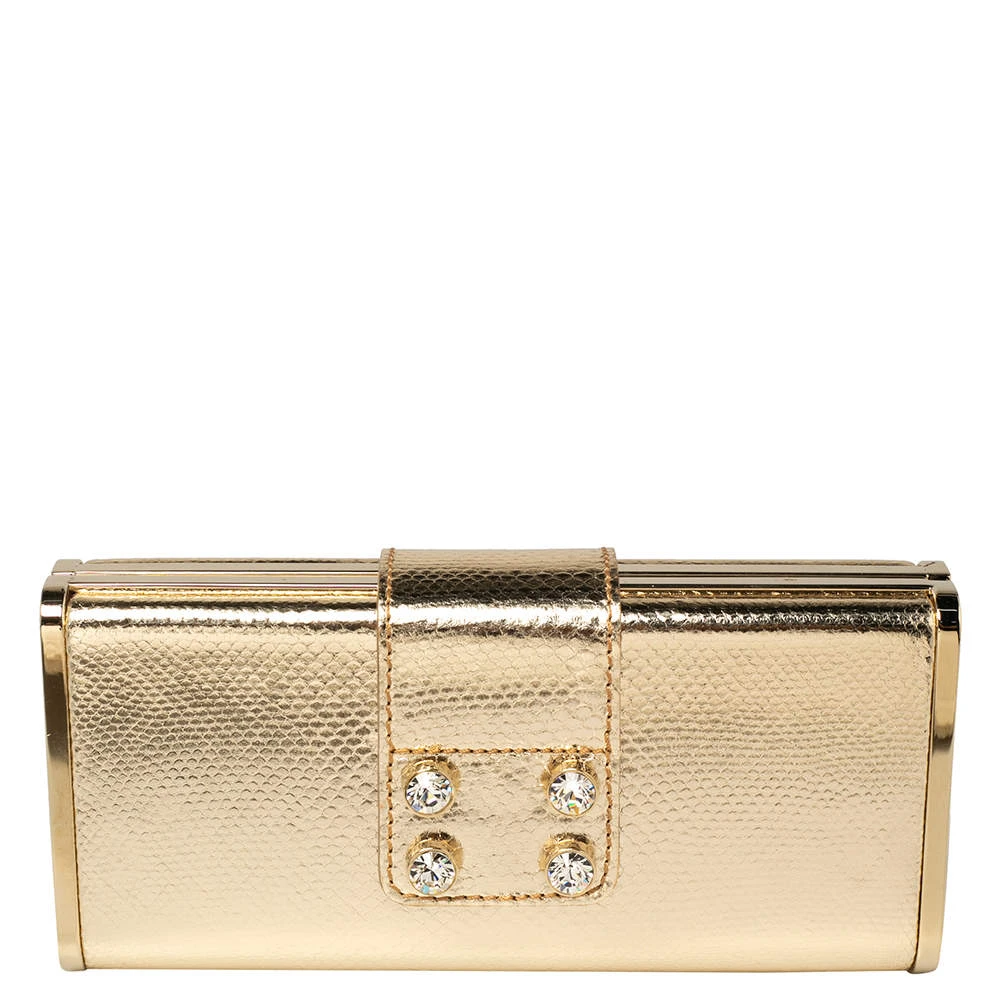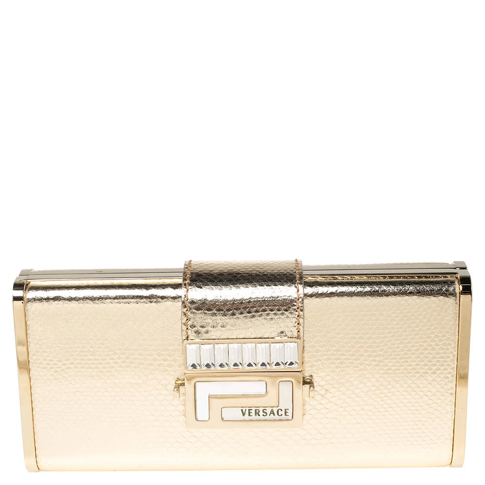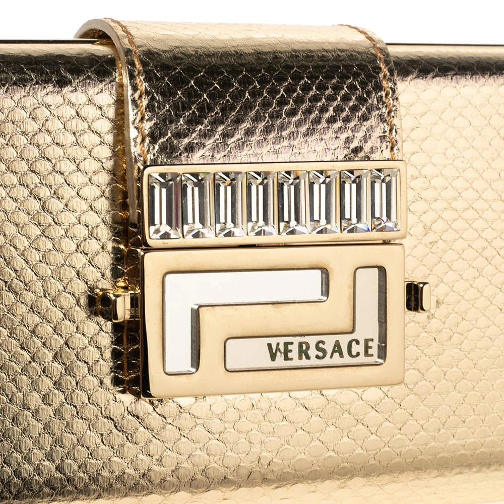 Pick this covetable Versace clutch and make a valuable addition to your closet. The label’s logo in gold-tone hardware sitting on the gold exterior is the petite bag’s winning feature. Made from karung leather, it is equipped with a flap and a satin-lined interior.