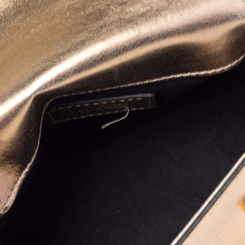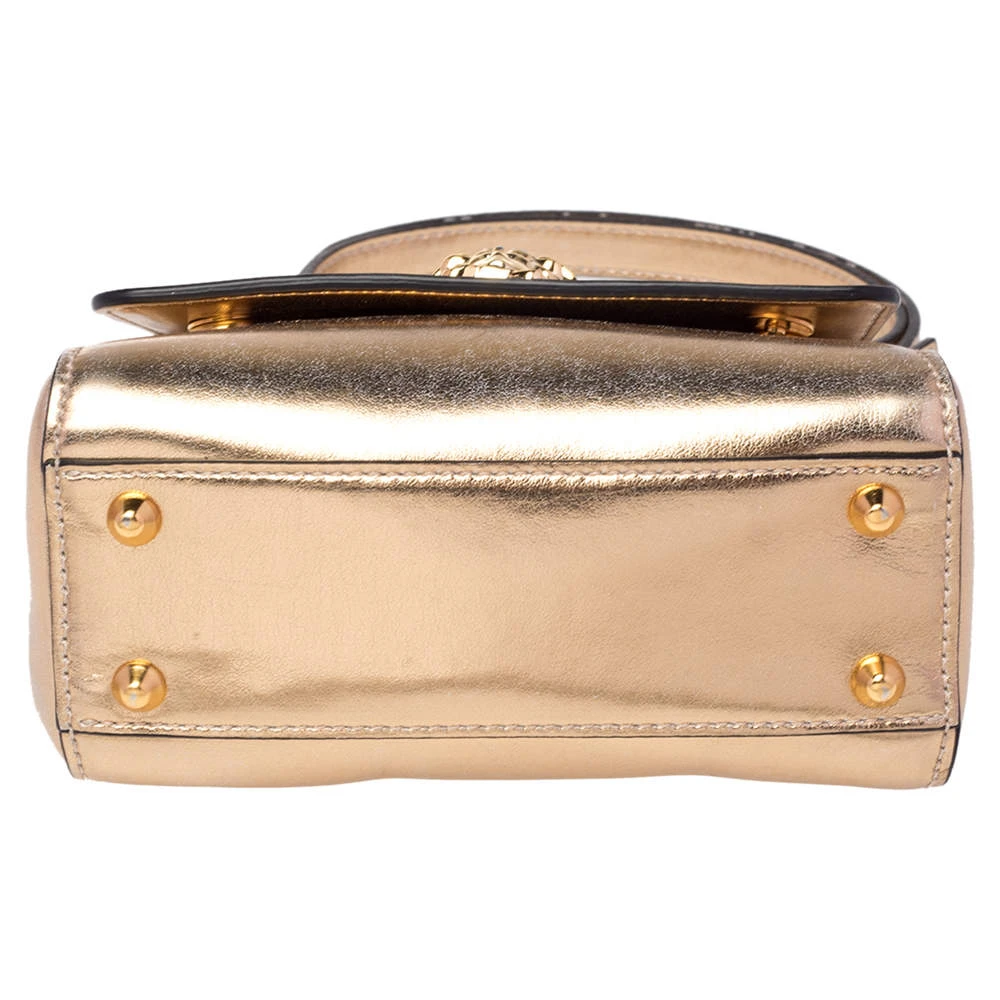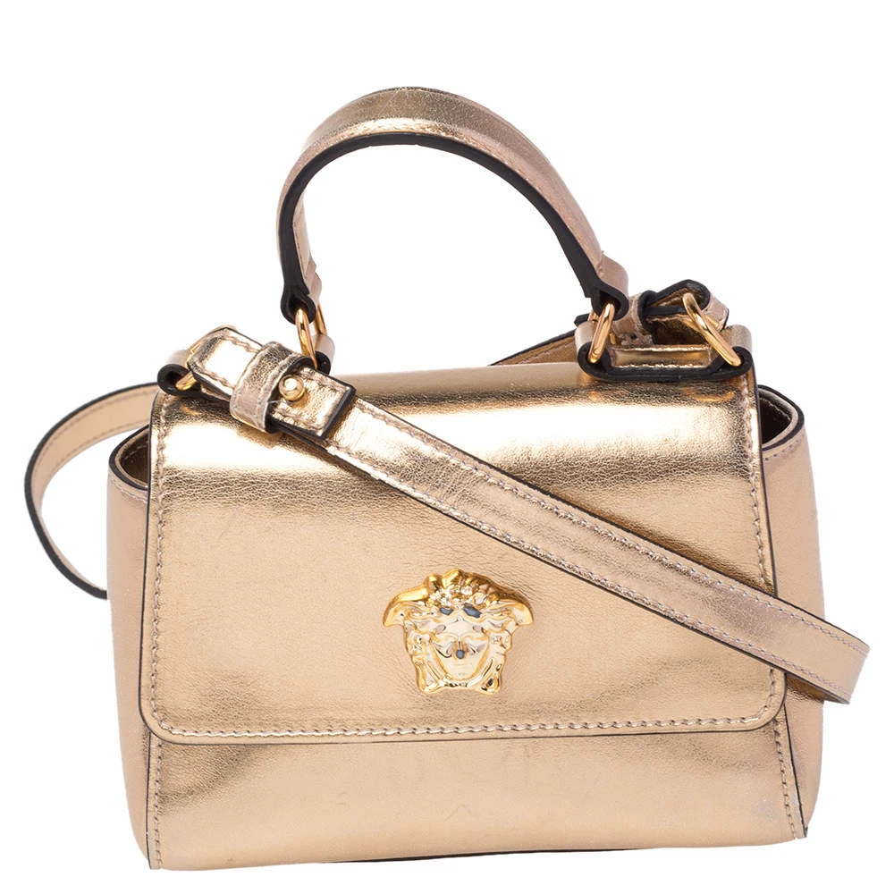 Comfortable and easy to carry, this Versace leather bag comes in metallic gold with the Medusa emblem on the front. It has a shoulder strap, a top handle, and an interior lined with fabric to keep your essentials organized and safe.