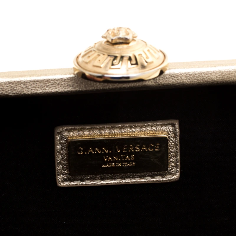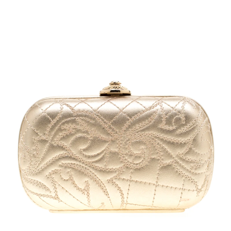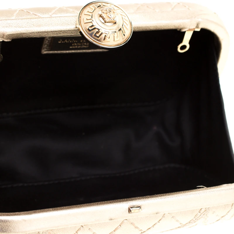 From the house of Versace comes this gorgeous clutch that will perfectly complement all your evening outfits. It has been crafted from gold leather and styled with quilting and a Medusa emblem that opens to a satin interior. This clutch wins with its structured silhouette and polished finish.