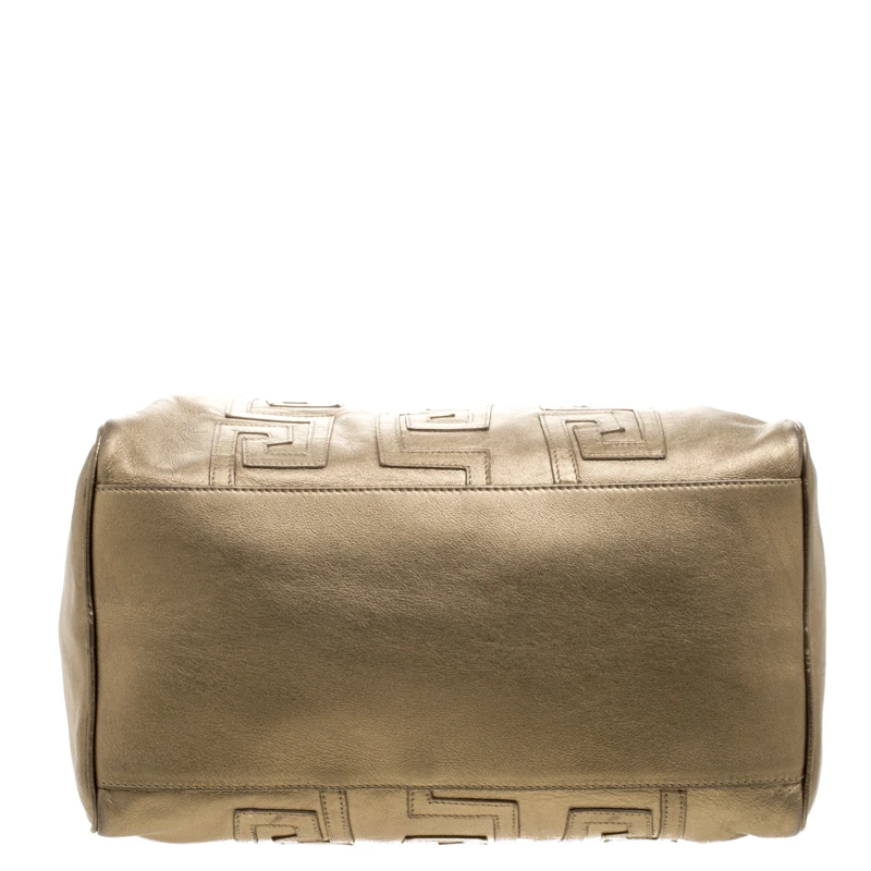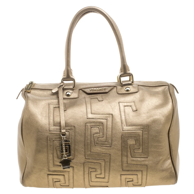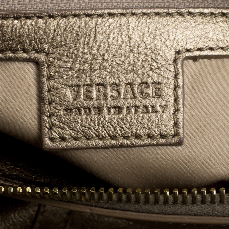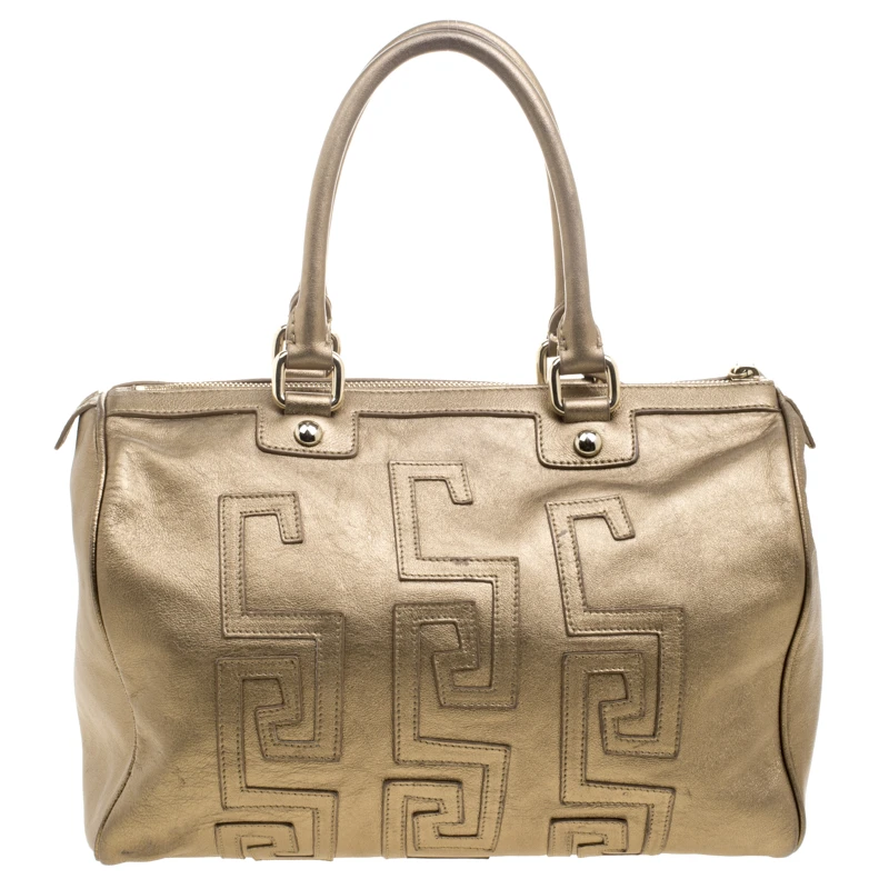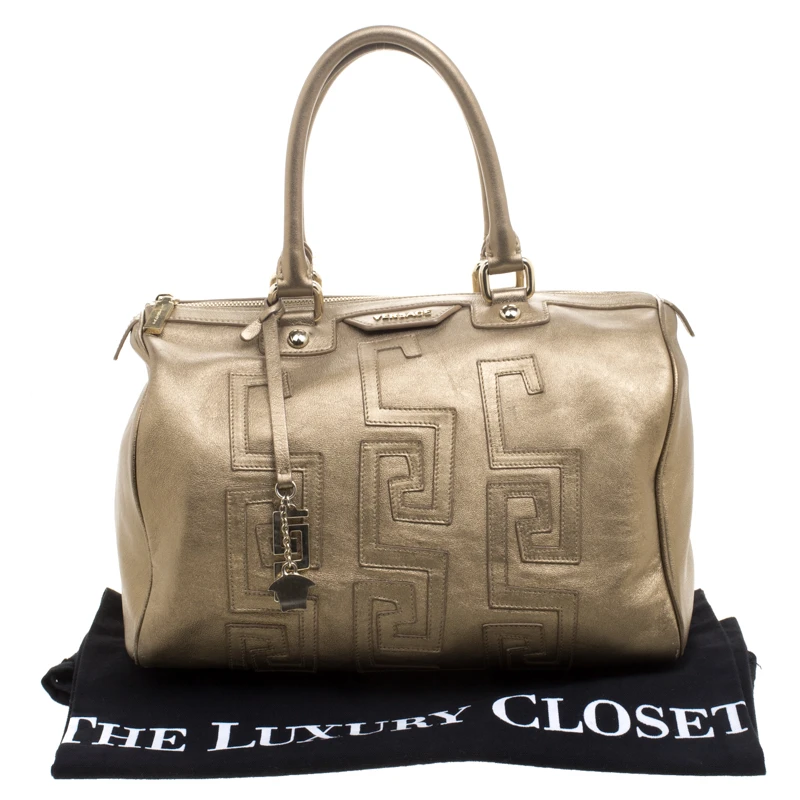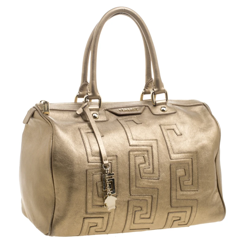 Spacious and captivating, this Boston bag is from Versace. It has been crafted from leather and equipped with a spacious satin interior, two rolled handles and a dangling charm.