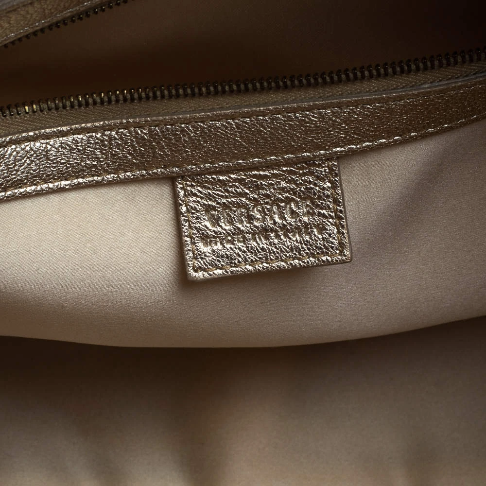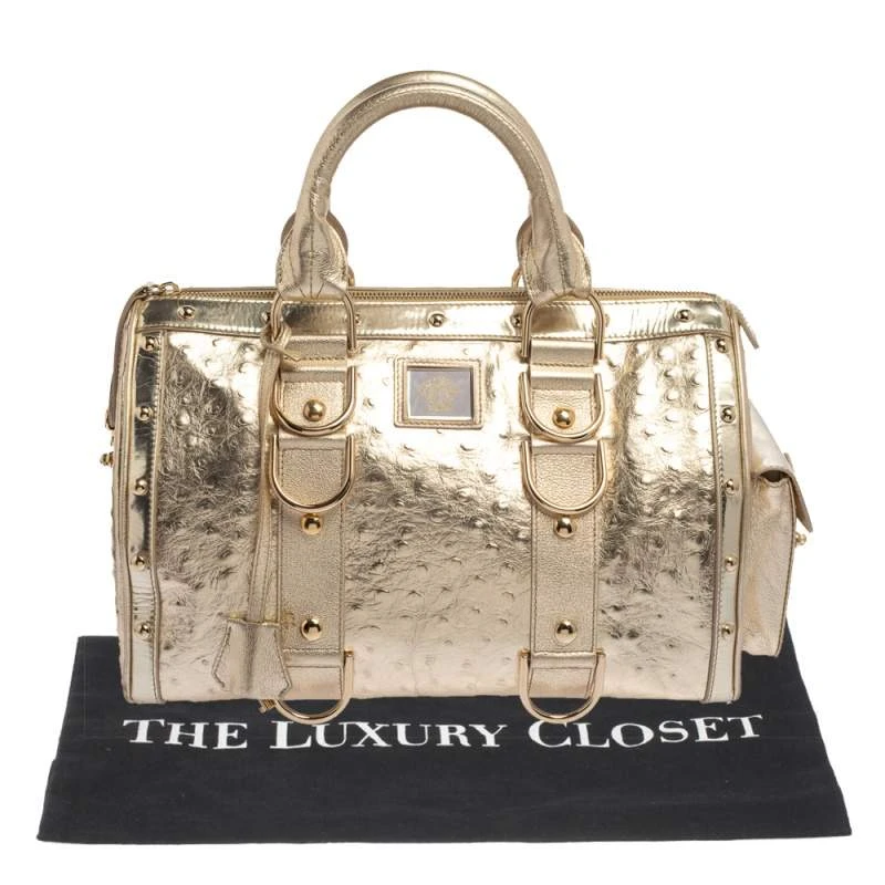 How gorgeous is this satchel from Versace! It carries an outstanding design and a fabulous interplay of ostrich-embossed leather and gold-tone hardware. It has a top leading to a satin interior while being held by two top handles. The shape and the brand logo on the front just uplift its beauty and makes it a buy you will not regret.