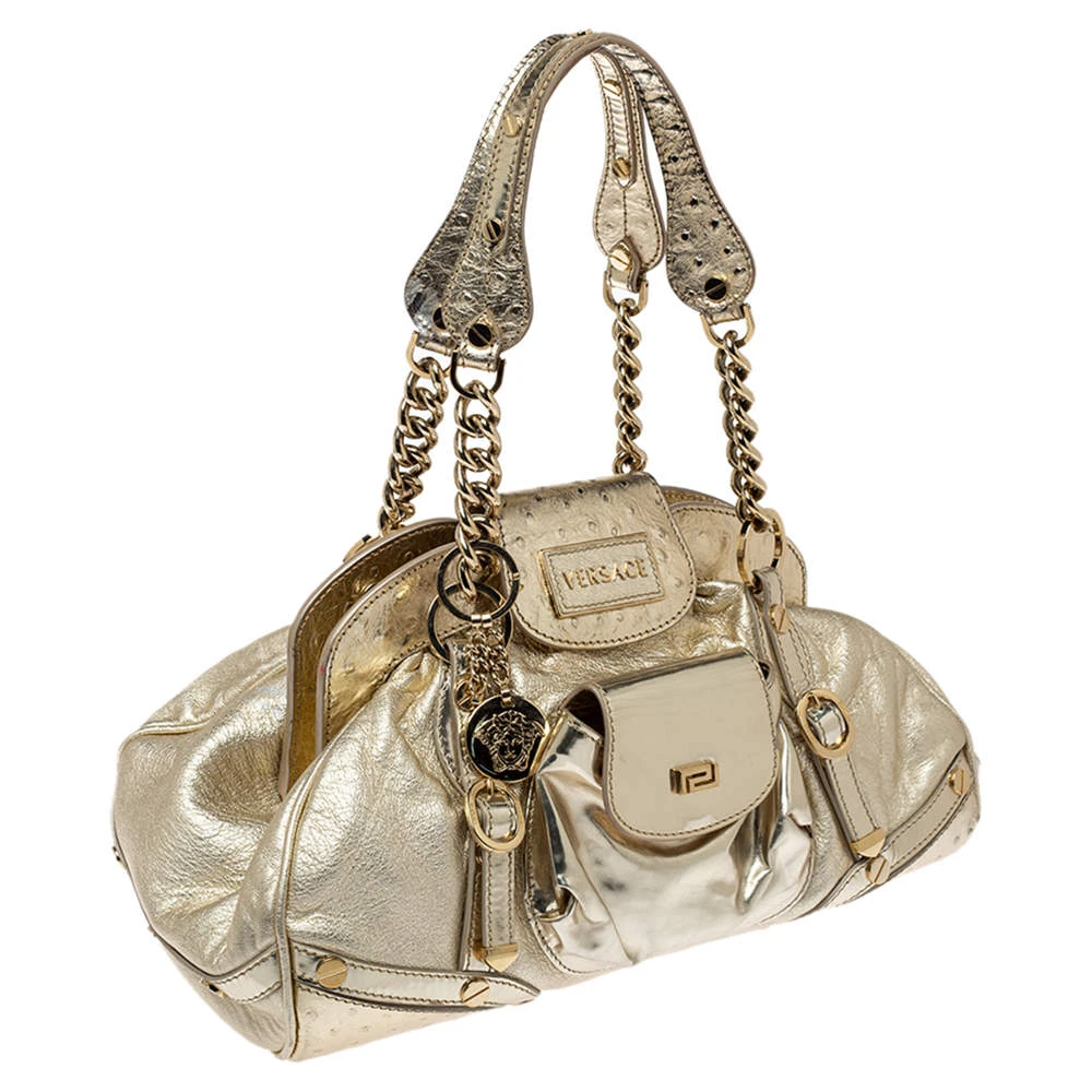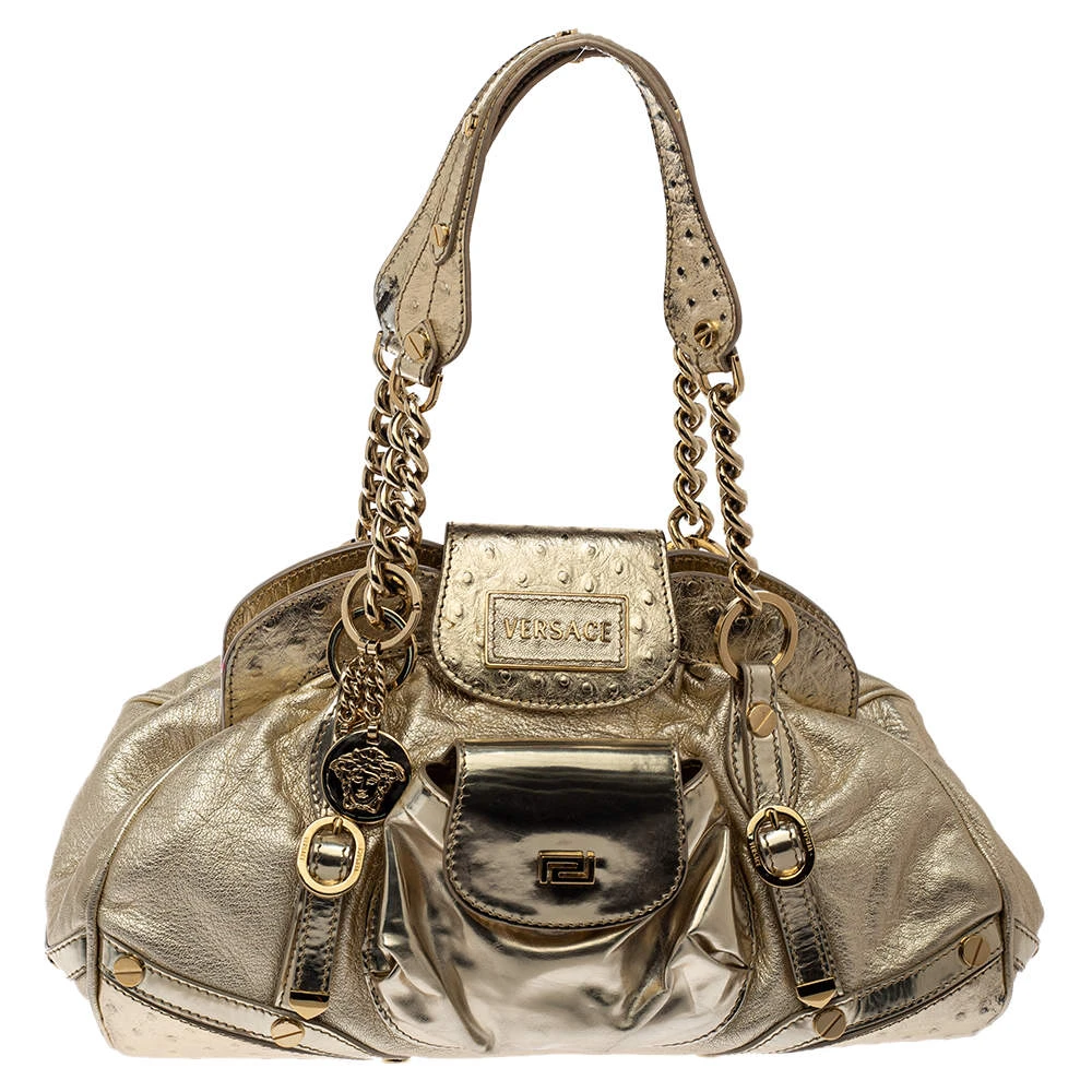 Stunning in appeal and high on style, this satchel from Versace has been crafted from patent leather and styled with gold-tone hardware and ostrich embossing. It comes with dual top handles of chains and leather rests. The interior is satin-lined and sized to hold your essentials.