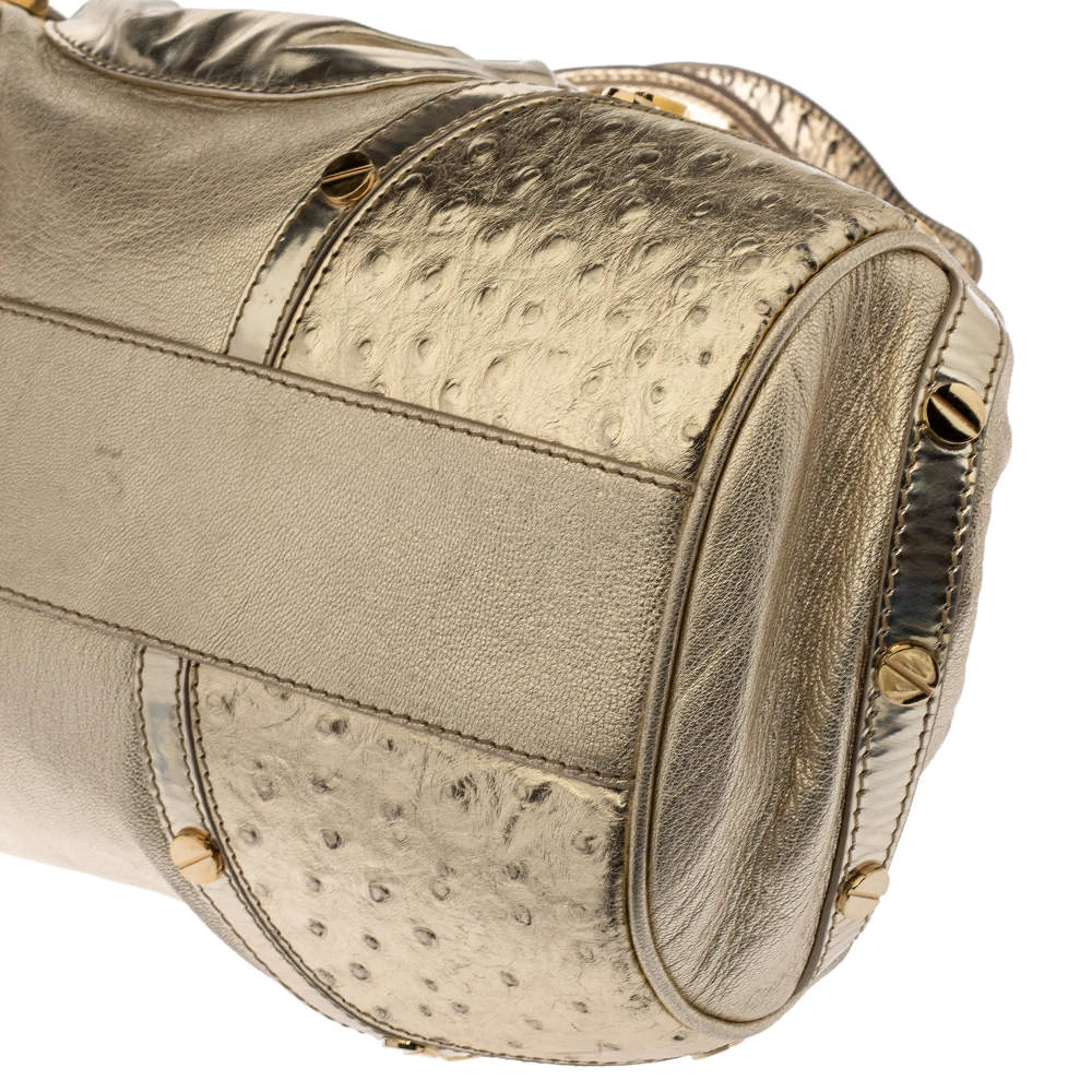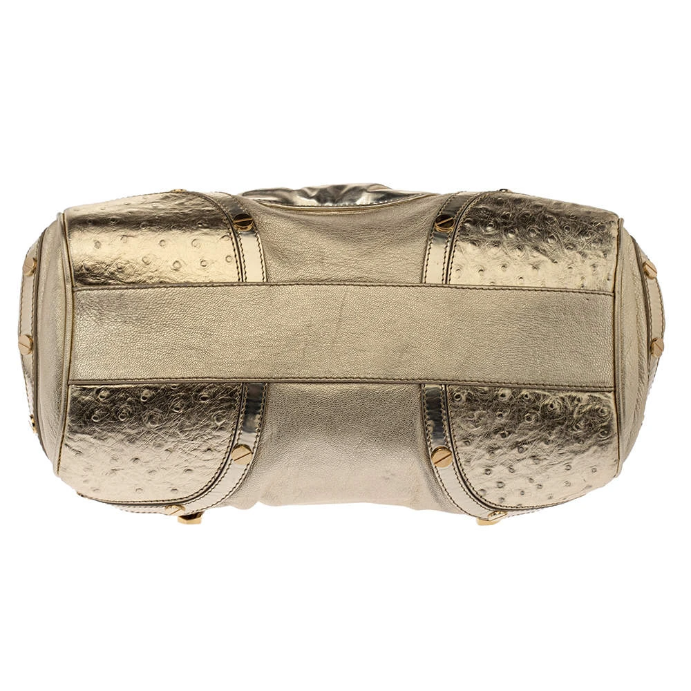 - Exterior Material: Gold Patent and Ostrich Embossed Leather
