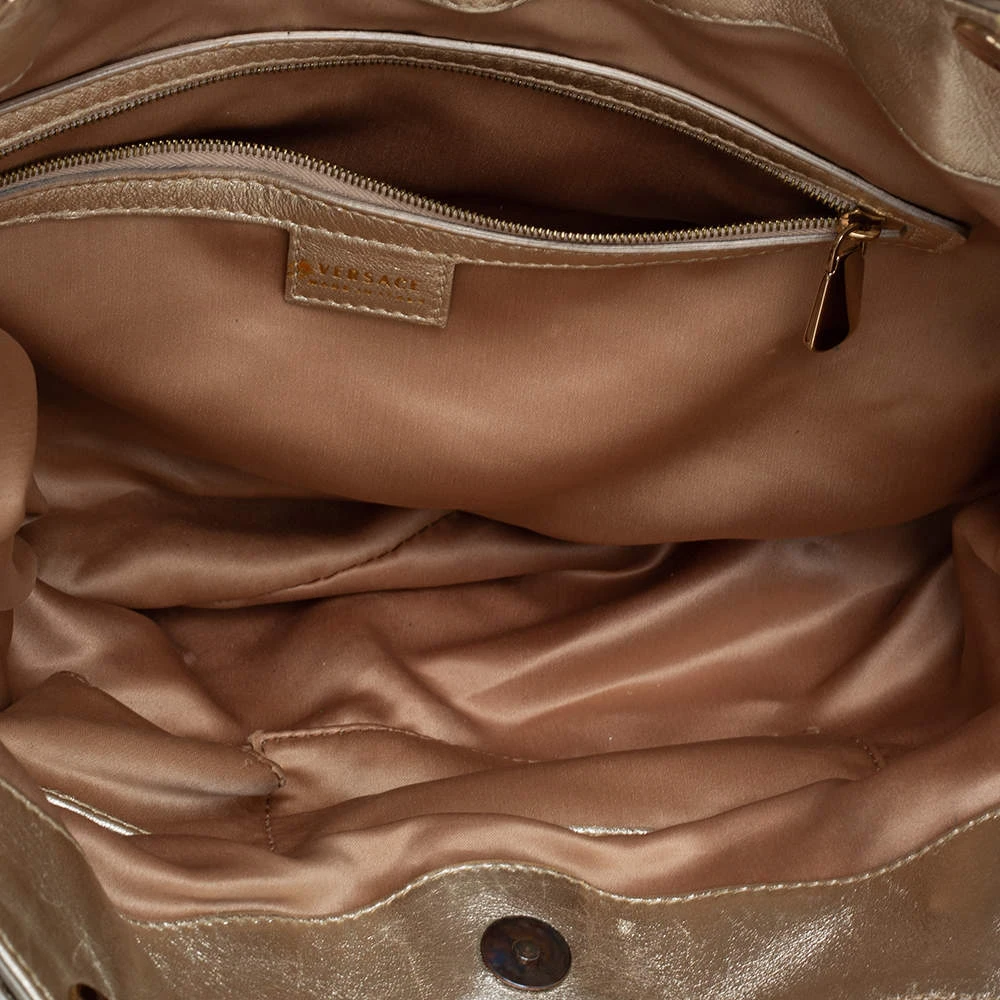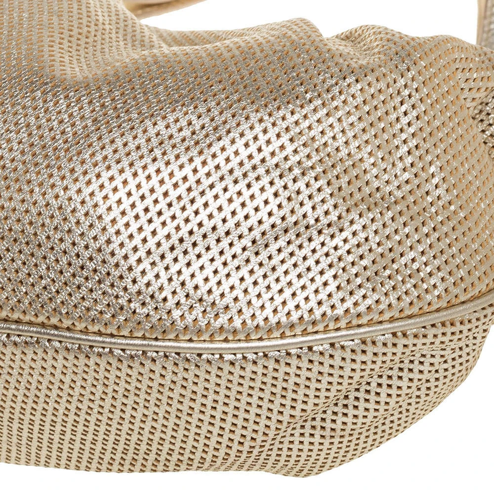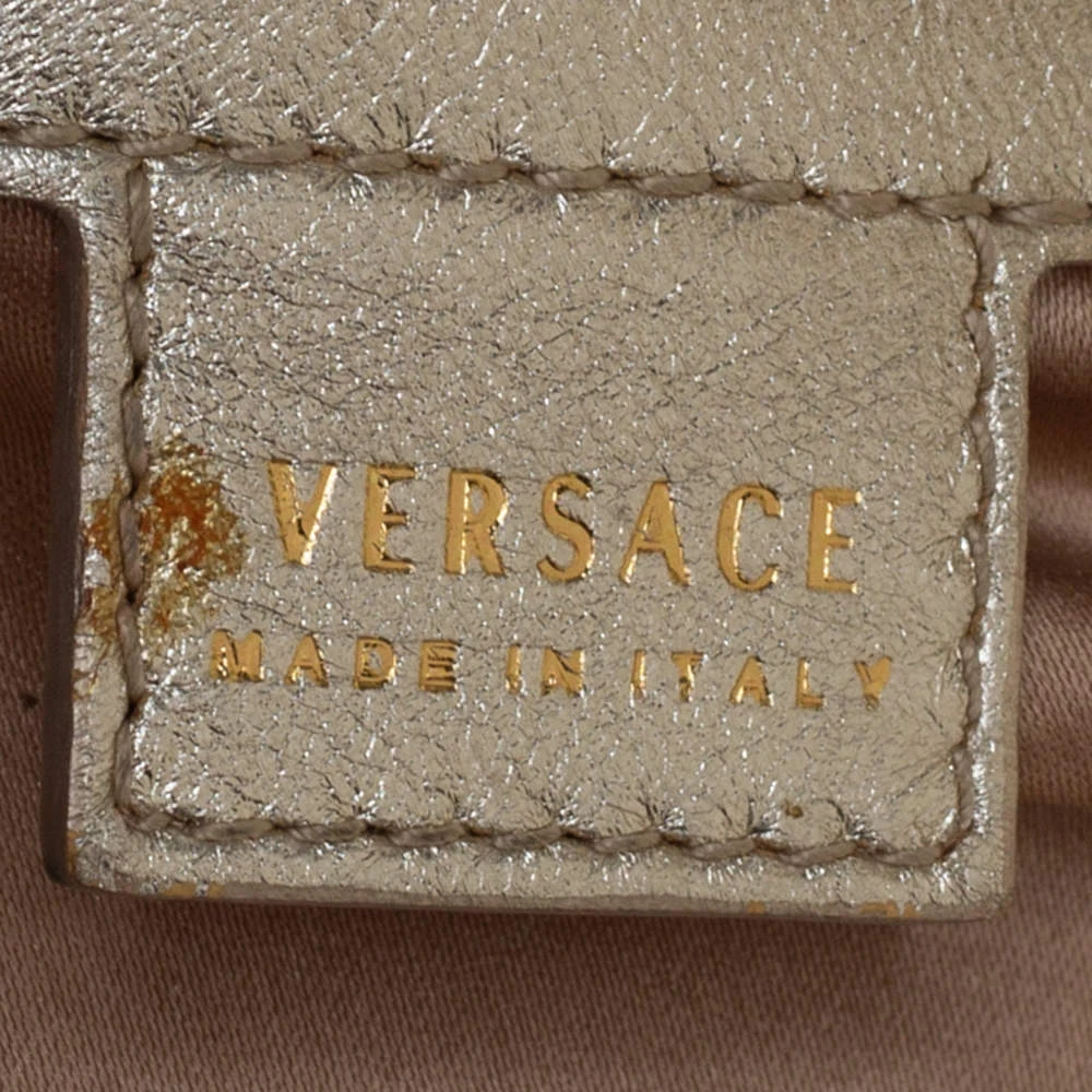 This gorgeous bag by Versace is glamorous. Crafted in Italy, it is made from perforated leather and comes in a lovely shade of gold. This shoulder bag features the signature logo & a tassel detail on the side. The bag opens to reveal a satin interior with enough space for essentials. It has dual handles and a shoulder strap.