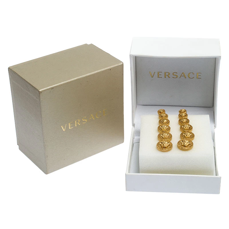 Earrings are the perfect accessory to complete any outfit. Made in Italy, these Versace earrings are feminine and modish. Crafted in gold-plated metal, the pair carries the famous Medusa engravings arranged in a stacked array. These pretty earrings are just right to add an elegant yet contemporary touch to your look.