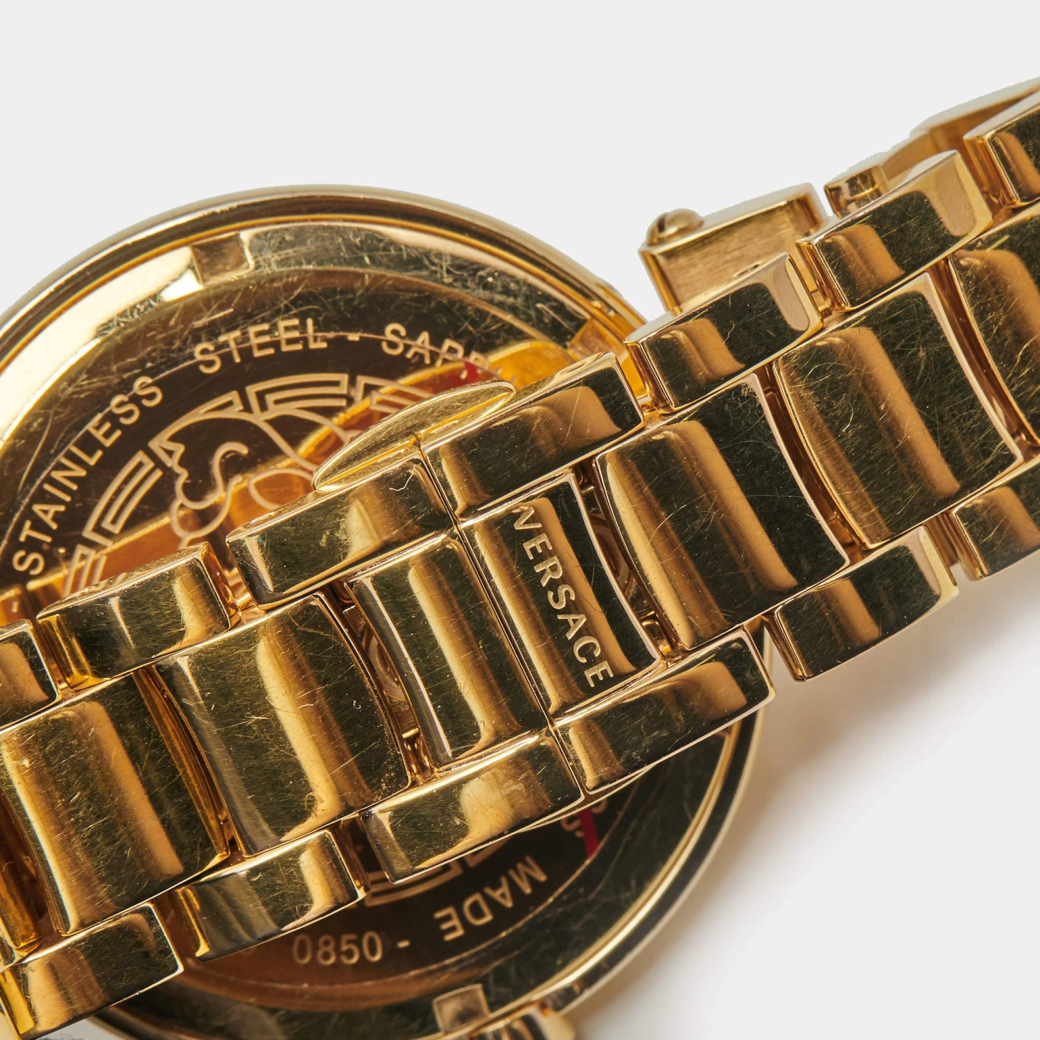 This Mystique women’s wristwatch by Versace has a gold-plated stainless steel bracelet and case that lends durability without compromising on glamour. The round bezel surrounds a lovely dial with dual hands. The dial is further beautified with a stunning hibiscus pattern that adds femininity and color. The case back mirrors the dial’s motifs. The creation runs on a quartz movement for accurate timekeeping.