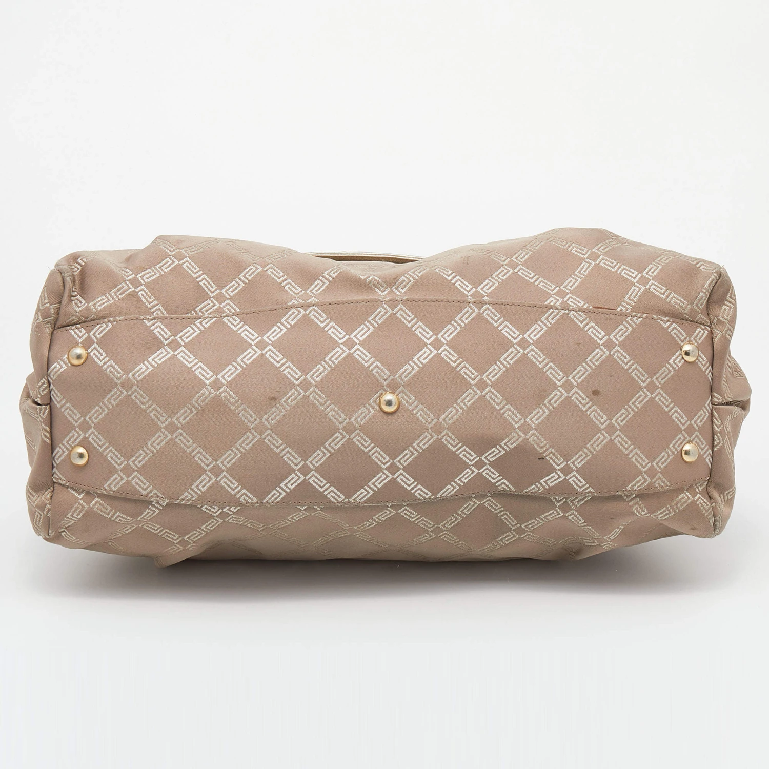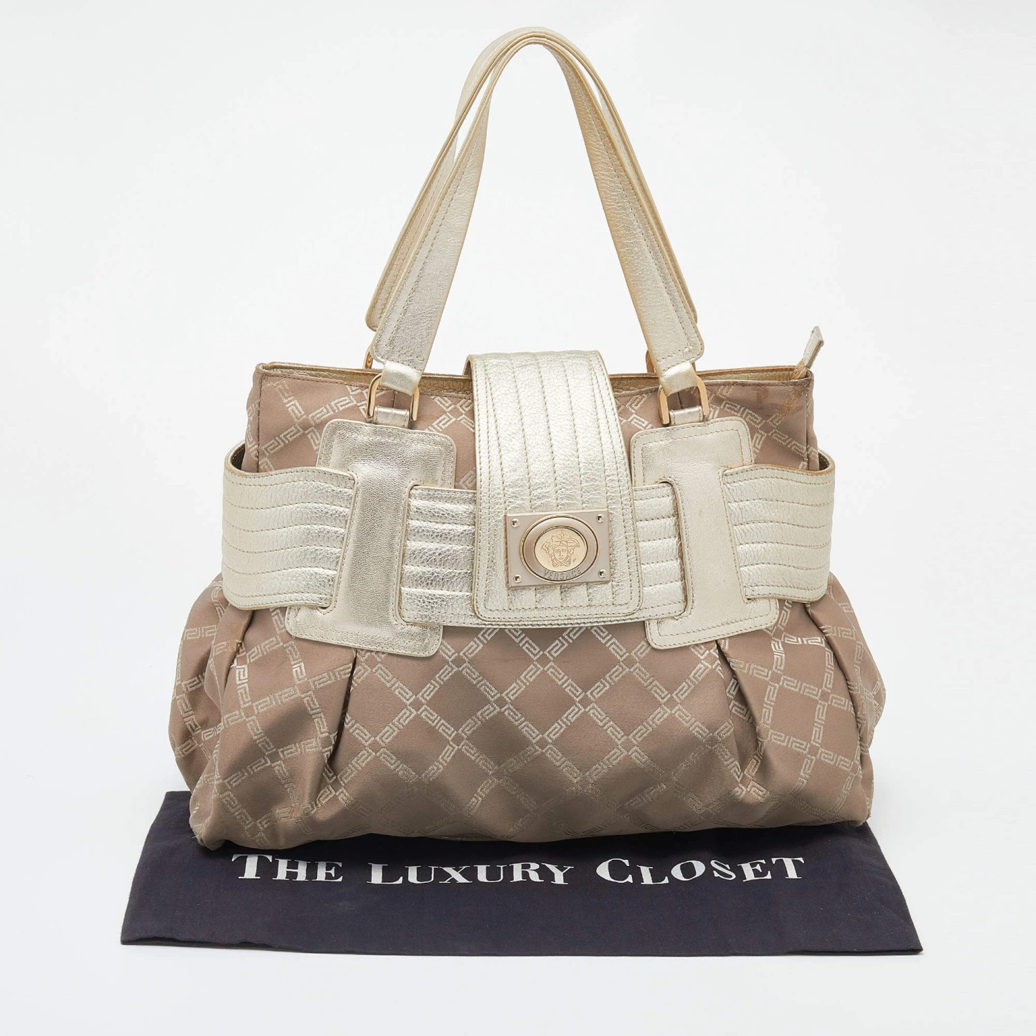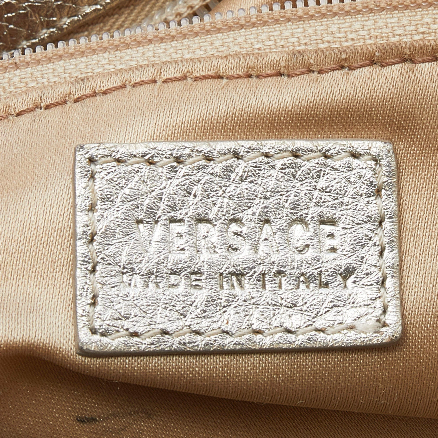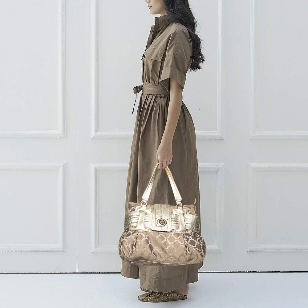 This Versace satchel is a symbol of style and reliability. This gold-colored bag is crafted from signature fabric and leather. It is equipped with a spacious satin interior, two handles, and the Medusa head on the front.
