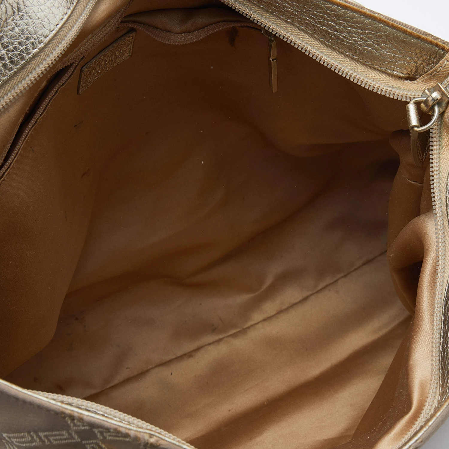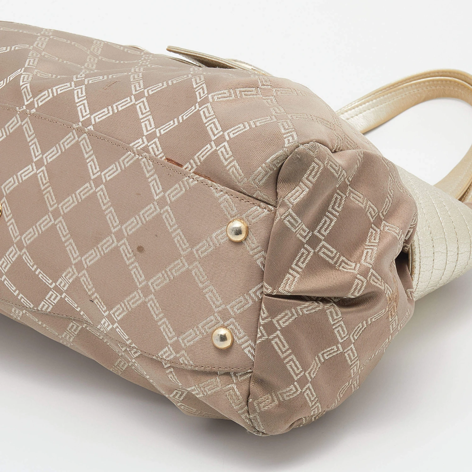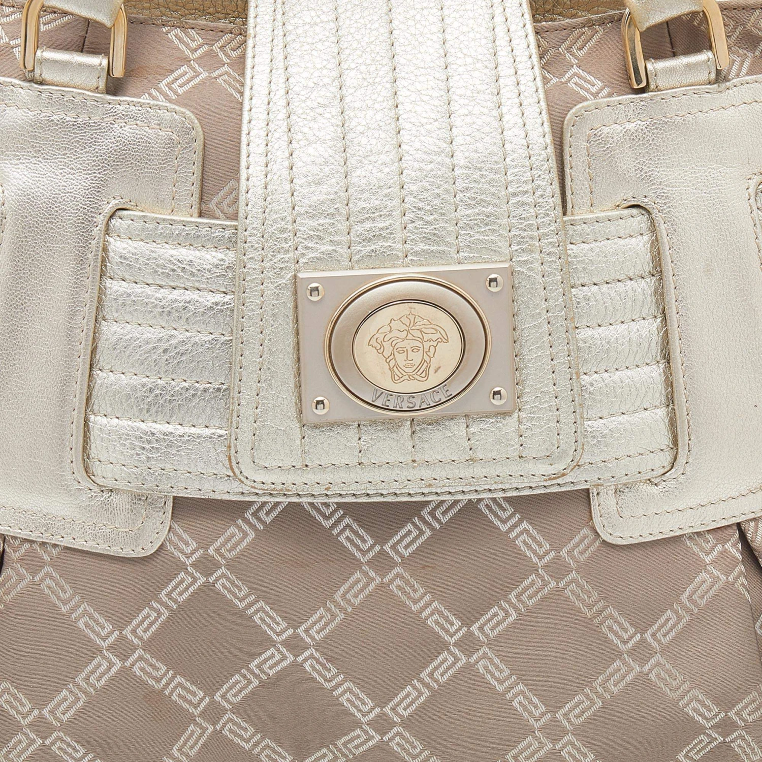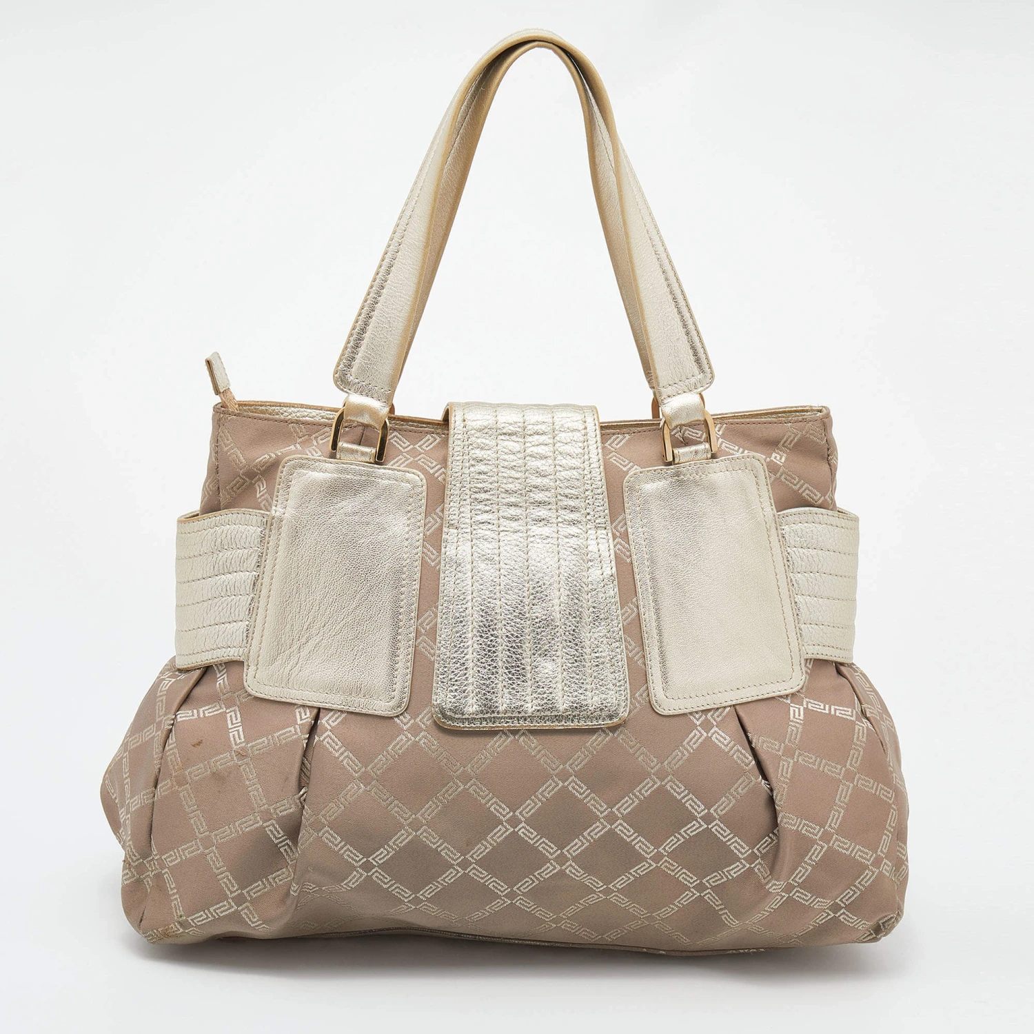 This Versace satchel is a symbol of style and reliability. This gold-colored bag is crafted from signature fabric and leather. It is equipped with a spacious satin interior, two handles, and the Medusa head on the front.