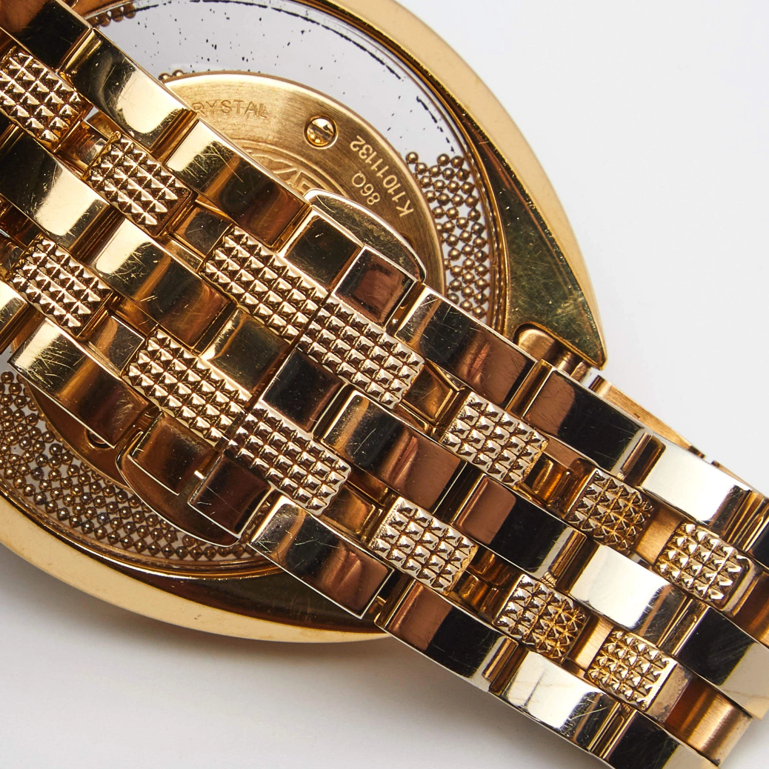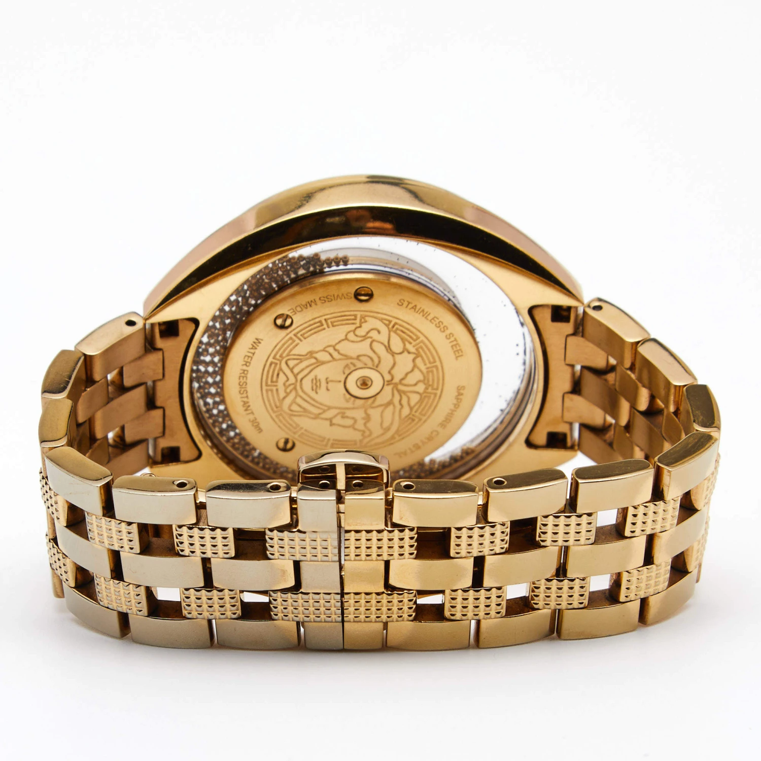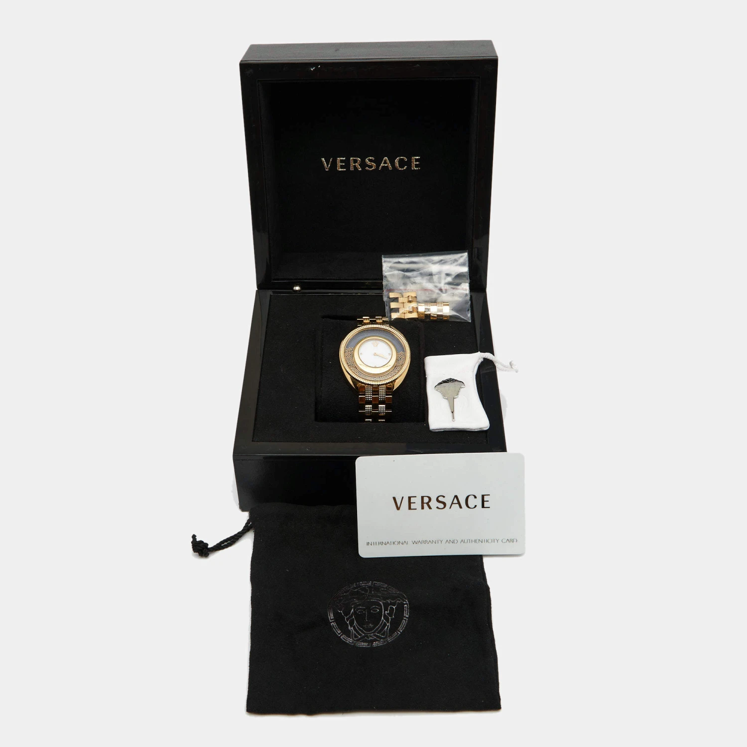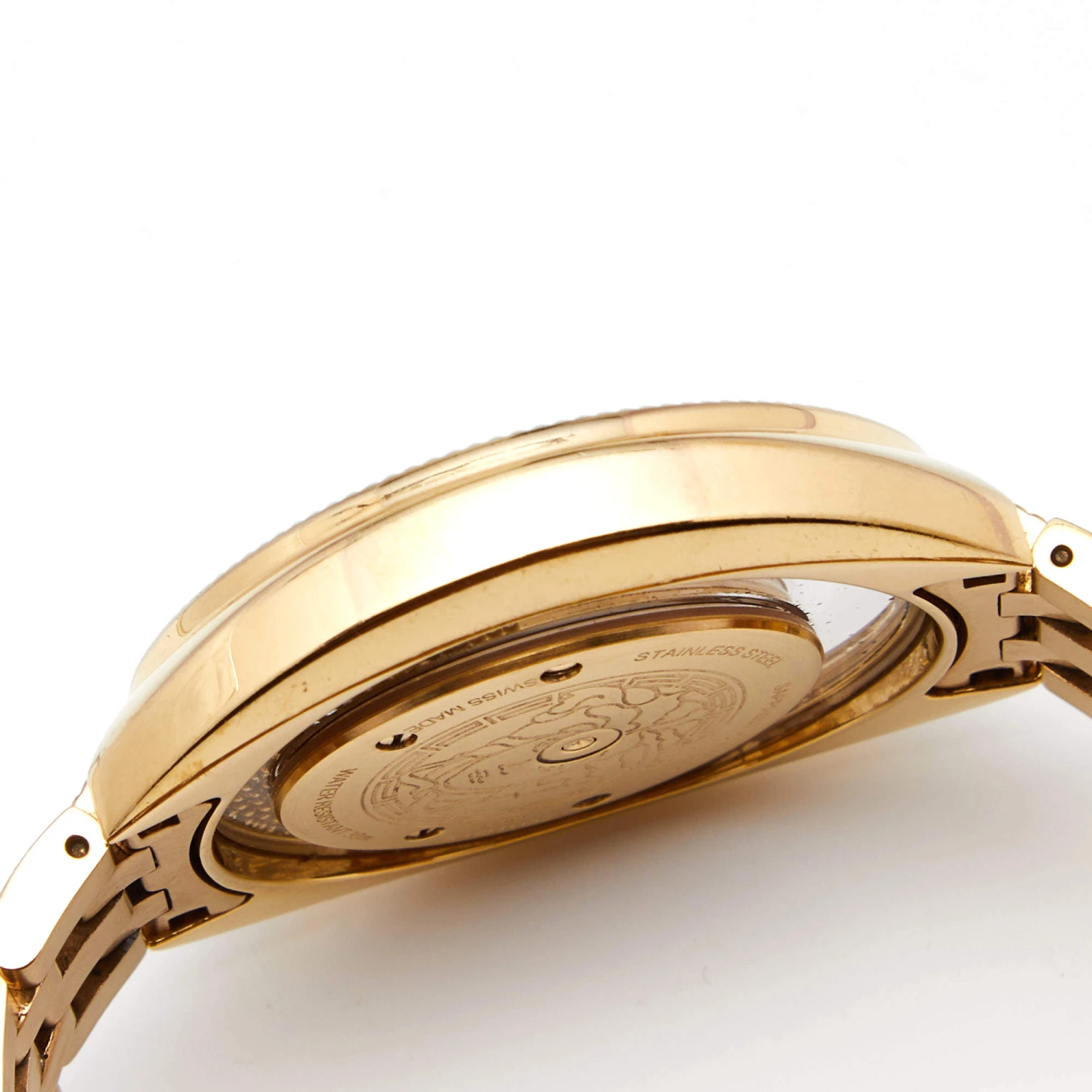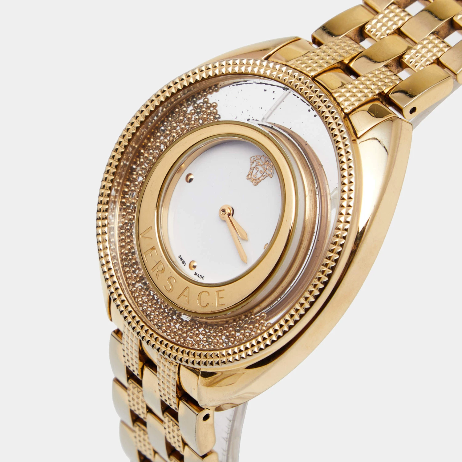 This beautiful timepiece from the house of Versace is sure to be a conversation starter with its eclectic and eye-catching design. Constructed in gold-plated stainless steel, this Destiny Spirit 86Q watch features a transparent panel on the case filled with little gold-tone beads floating as you move.
