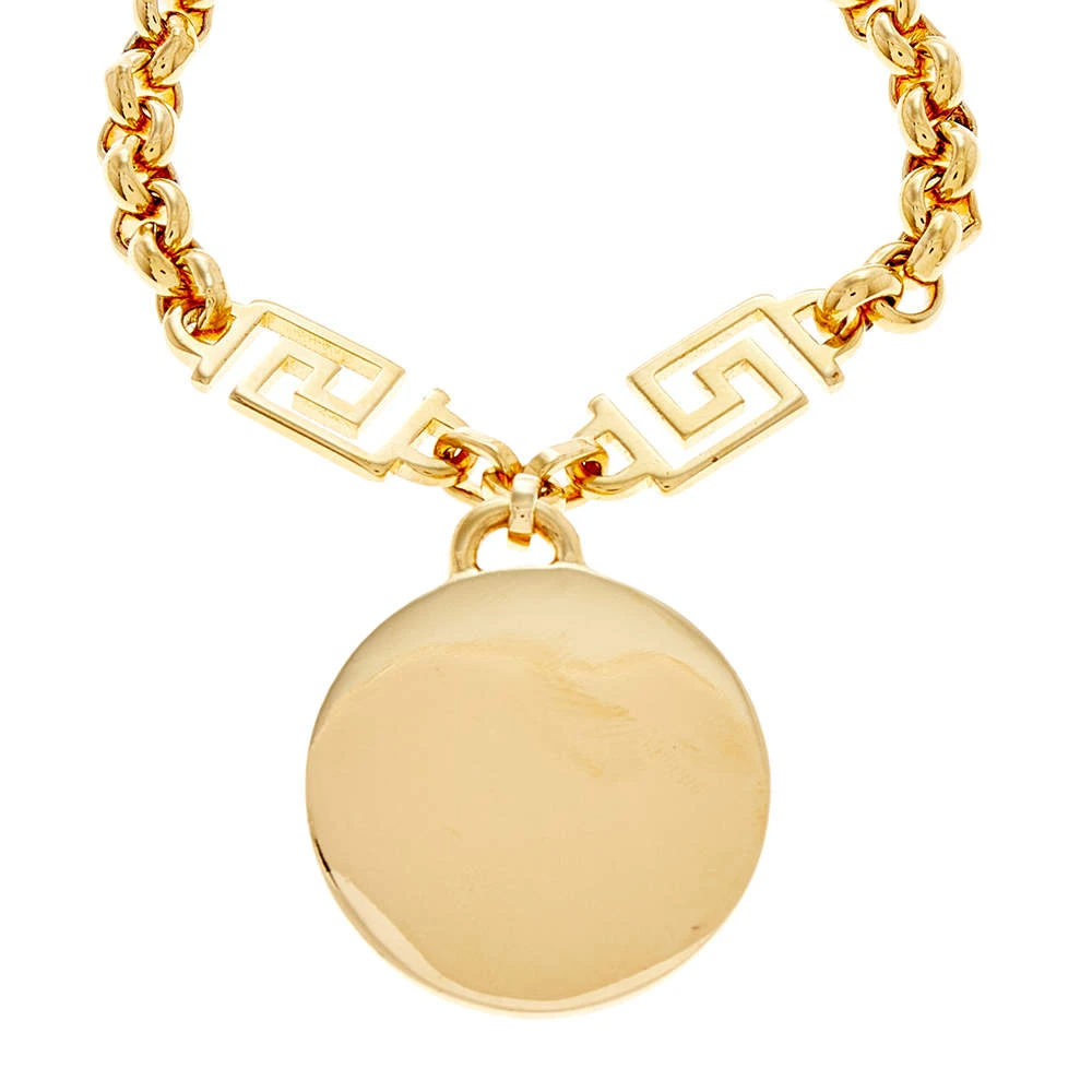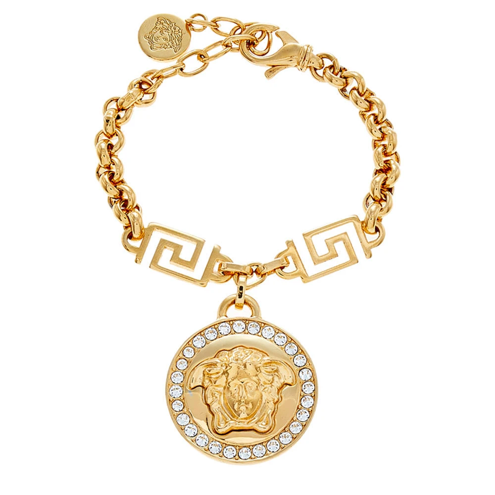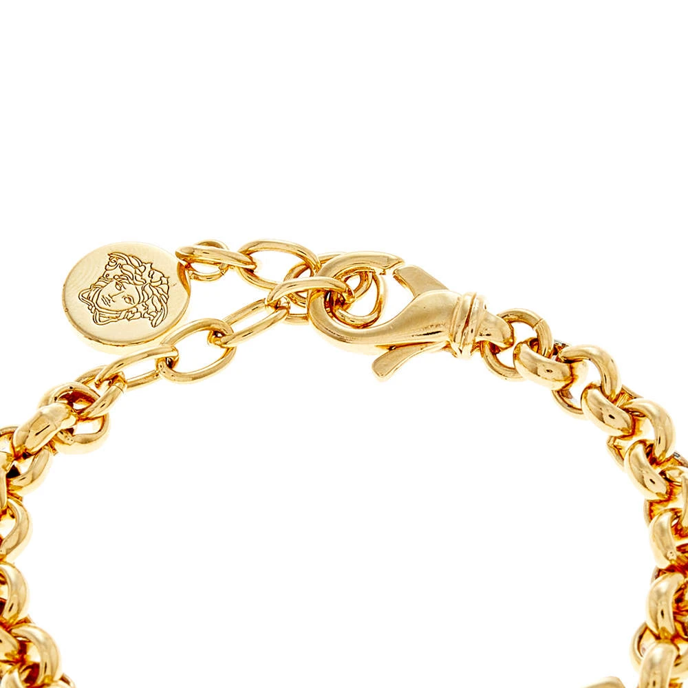 A chunky bracelet from Versace, this gold-tone piece comes with adjustable loops to ensure the perfect fit. The charm that dangles from the piece features the iconic Medusa motif. Studded with crystals for a luxe finish, it is secured by a lobster clasp.