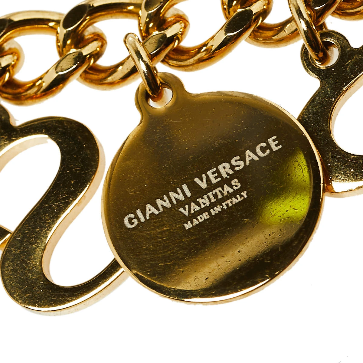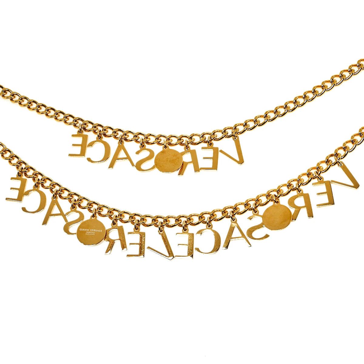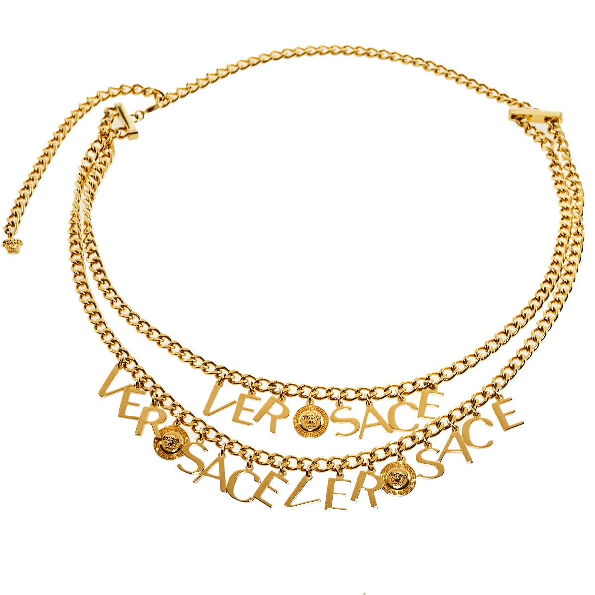 This distinctive, eye-catching belt from the house of Versace will help you accessorize your outfits in the most desirable manner. Made from gold-tone metal, the chain belt has a layered front embellished with brand letters and Medusa charms.