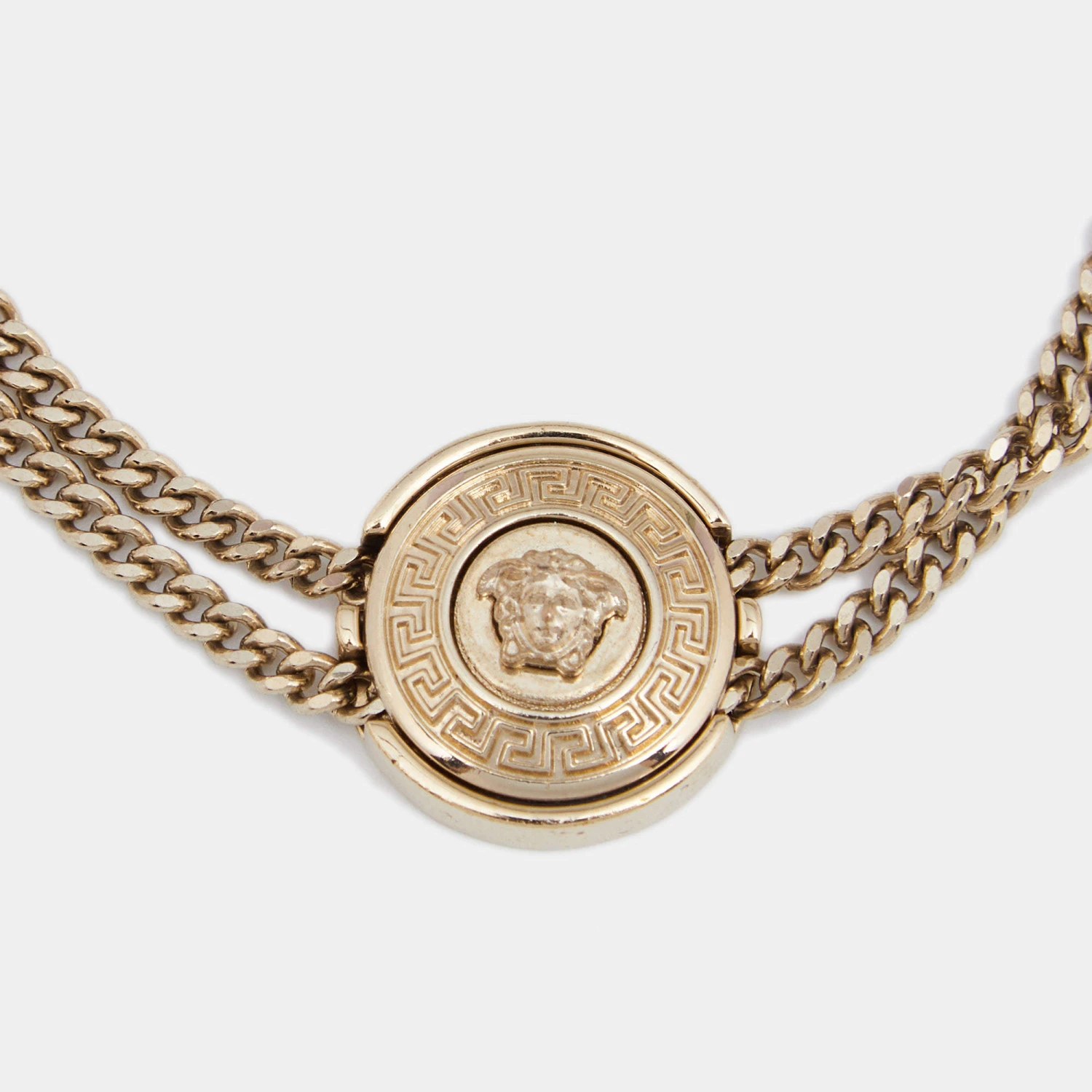 An icon of the Italian house, Versace’s Medusa makes an elegant appearance on this bracelet. It is rendered in gold-tone metal and features a chain link body with the signature motif at the center.