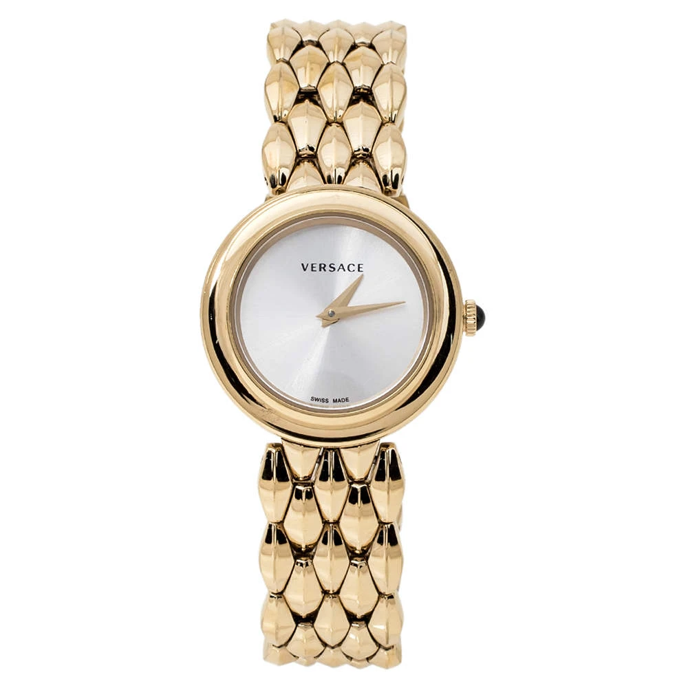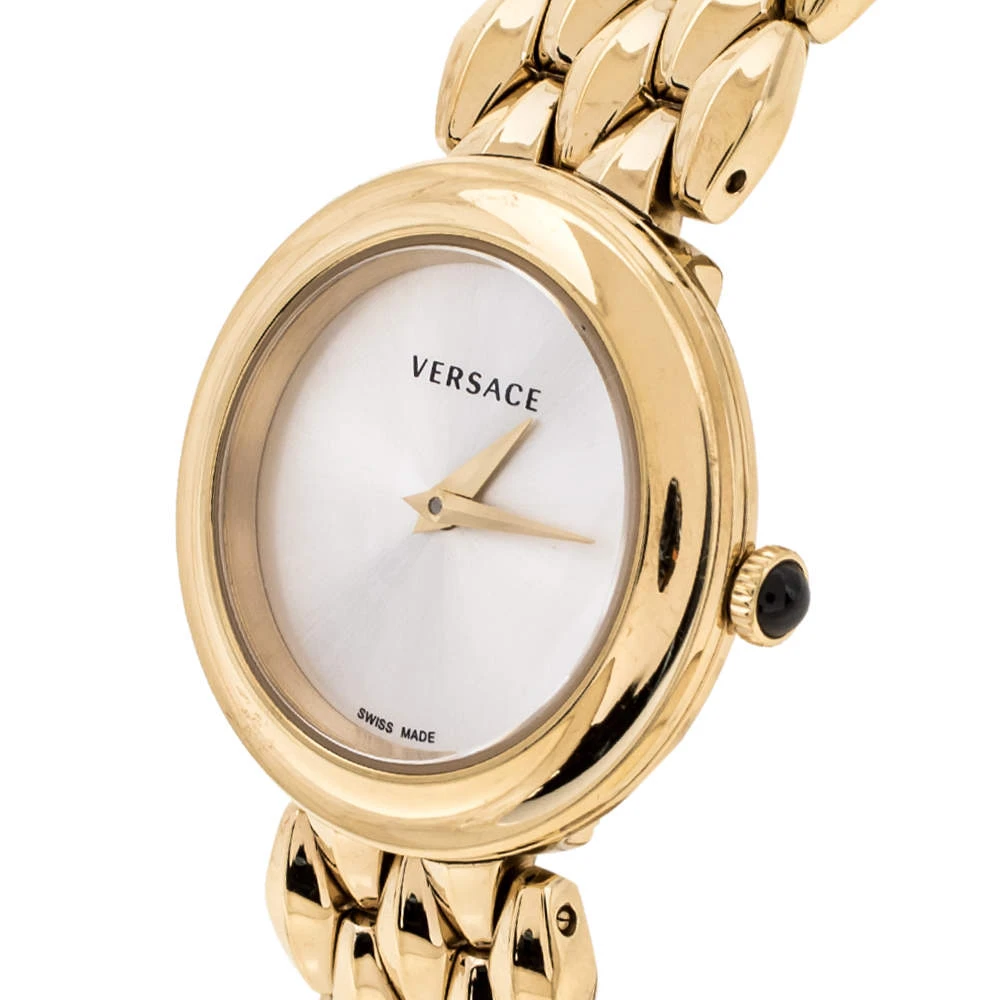 Your unique style deserves a luxurious touch like this V-Flare VEBN timepiece from Versace. Its gold-tone stainless steel case has a diameter of 28 mm and a smooth bezel. The dial features two petite hands and the brand name and the quartz watch is complete with an interlocking gold-tone stainless steel bracelet that fastens with the help of a push-button deployment clasp. Equipped with a water resistance of 30 meters, this stunner will look perfect on the wrist of a watch lover like you!