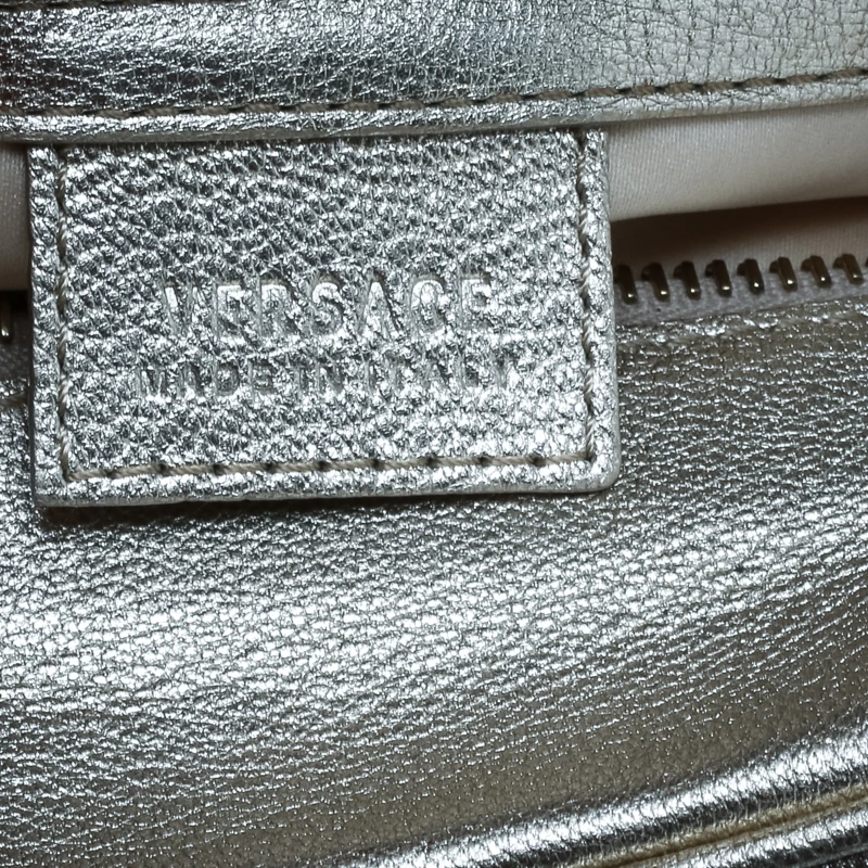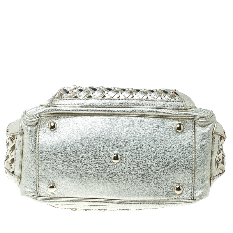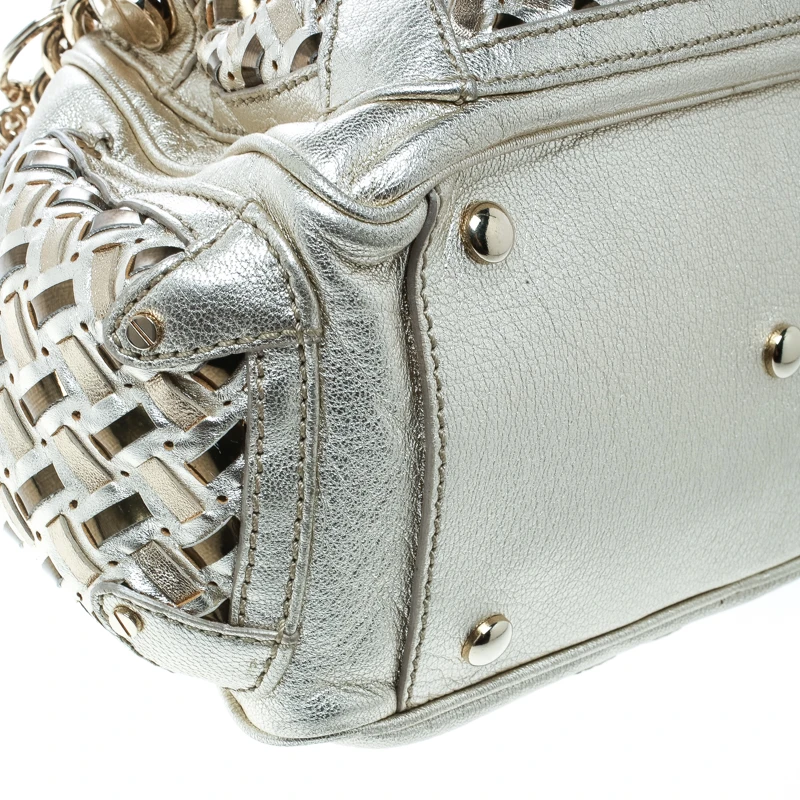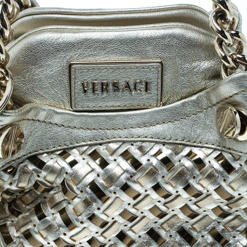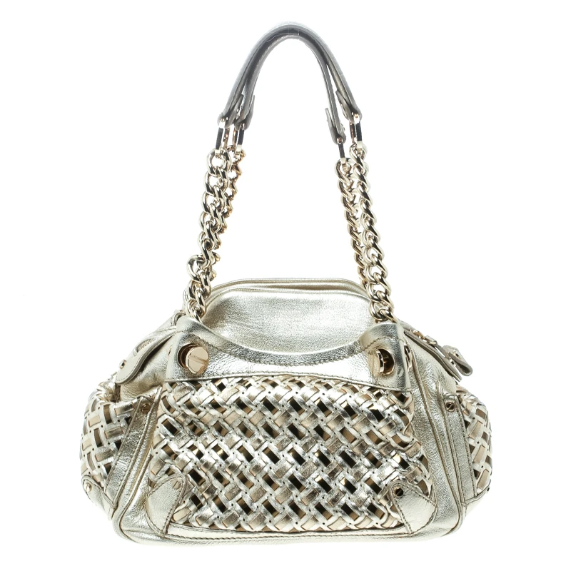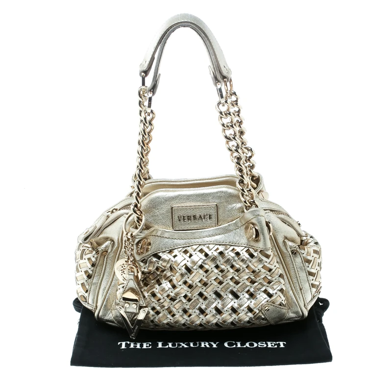 Flaunt this Versace satchel with any style for any occasion. Designed in a gold woven leather, this satchel features stitched detailing and the brand details along with a slip pocket on the front. It comes with chain-link shoulders having leather shoulder rests and is accented with gold-tone hardware. The top zip closure opens to a satin-lined interior featuring one sip and one slip pocket. This satchel is undoubtedly a total eye-catching piece!