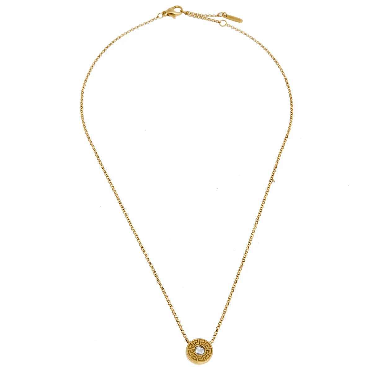 This beautiful Versace necklace is fully handcrafted from 18k yellow gold into a minimal yet timeless silhouette exuding modern aesthetics and unparalleled elegance. The masterfully sculpted pendant cages a diamond at its heart and is adorned with the Greca motif. The creation is secured by a lobster clasp.