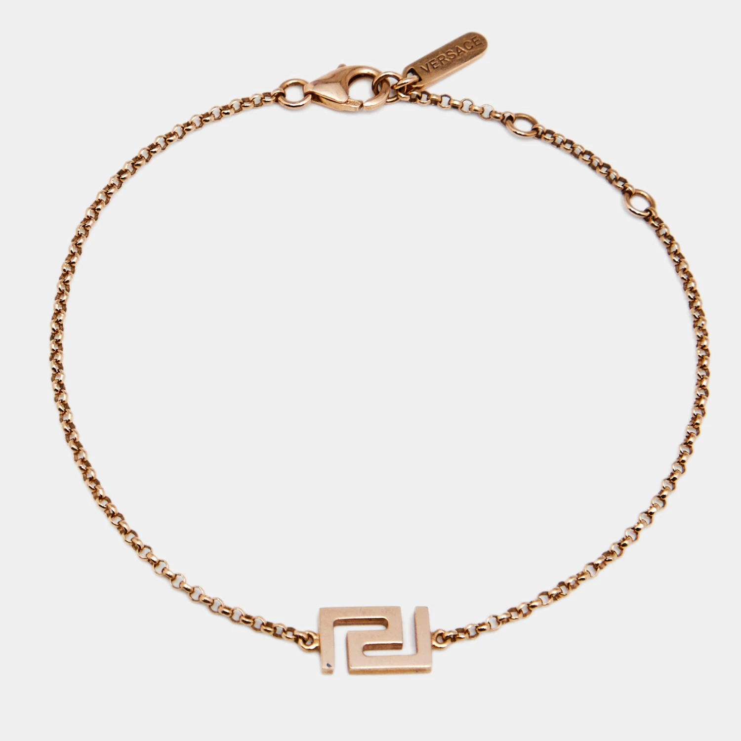 Artfully made from 18k yellow gold, this flawless bracelet by Versace can be your next prized possession. Featuring a gorgeous signature Greek key charm, the design is finished with a lobster clasp on the chain. The piece is simple and elegant.