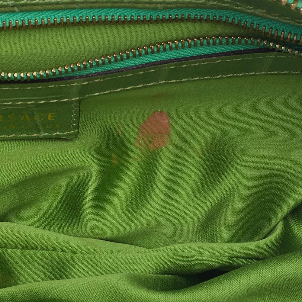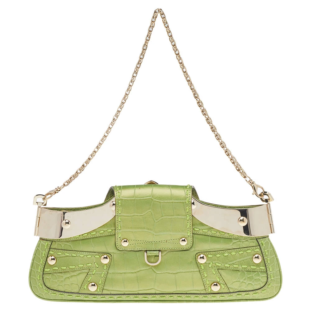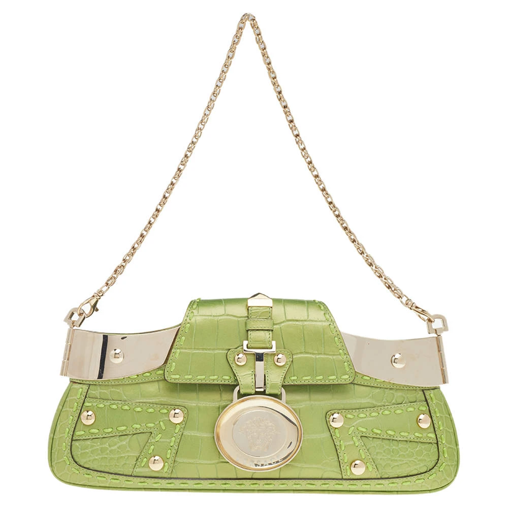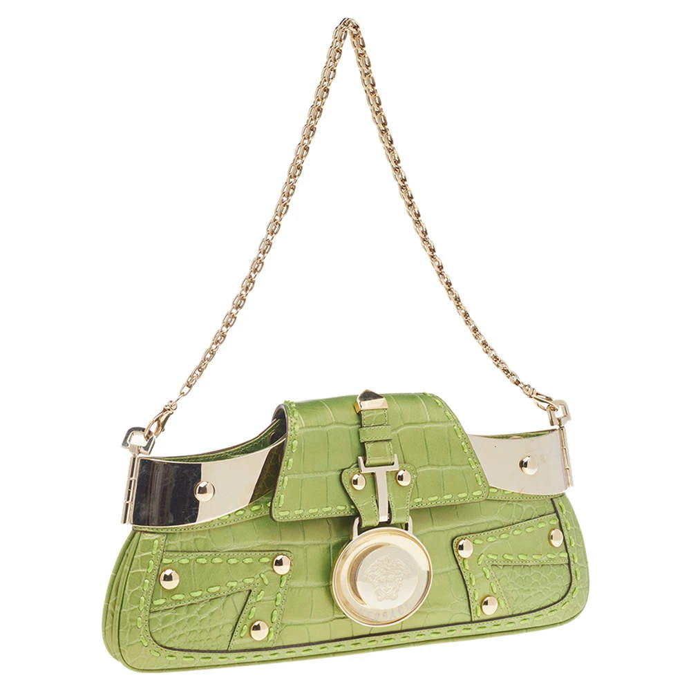 Beautifully crafted, this clutch bag by Versace is a must-have for your party and evening style edit. Crafted from croc-embossed leather, it is detailed with the brand logo on the front flap. It opens to a lined interior and is finished with a chain.