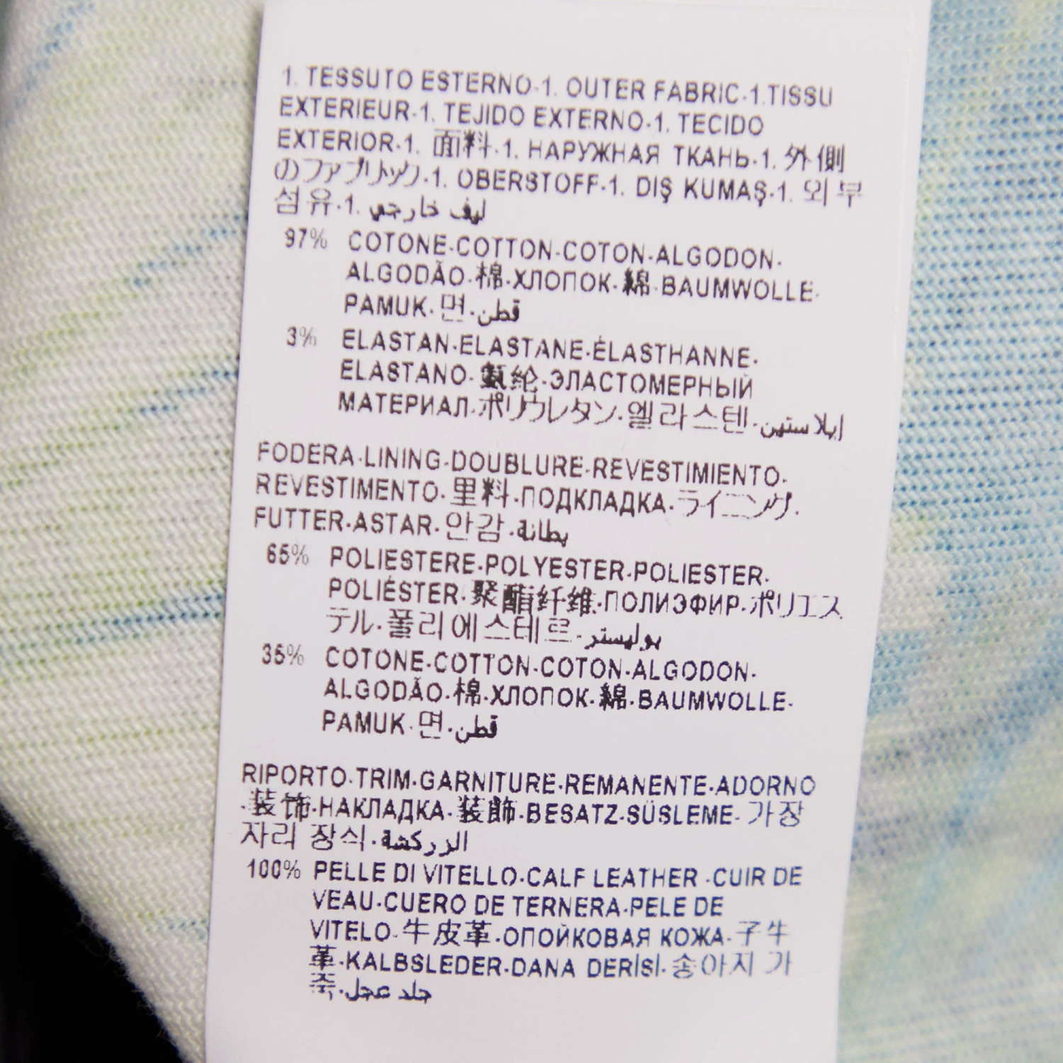 - Composition: Shell: 97% Cotton, 3% Elastane ; Lining: 65% Polyester, 35% Cotton ; Trim: 100% Leather