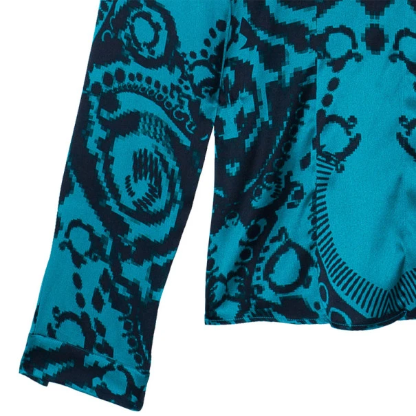 Sport this Versace pixel printed silk shirt at work or on a night out and wow everyone around you! Pair it with a black pencil skirt for a fabulous look. It features long sleeves, a gorgeous black print contrasting the green canvas, a classic collar and 100% silk material so that it’s light and flowy on your skin!Original Retail Price: US $995