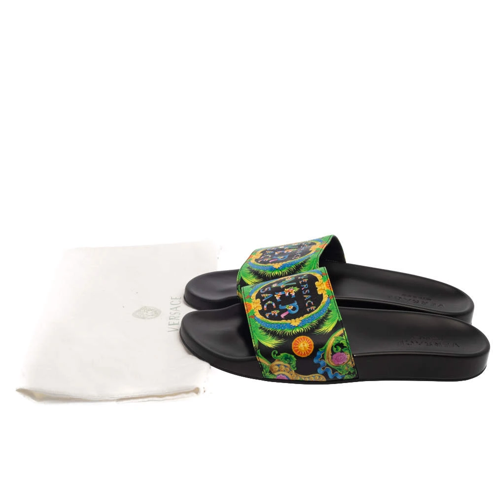 Perfectly blending comfort and style, these slide sandals from Versace need to be owned by you! They are crafted from leather in an open toe silhouette and styled with vibrant green logo printed vamp straps. They are equipped with comfortable rubber insoles and durable outsoles.