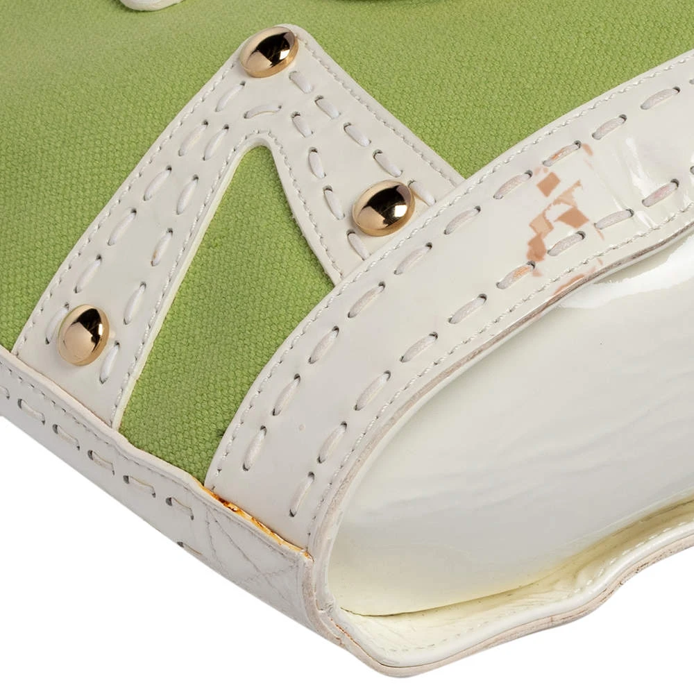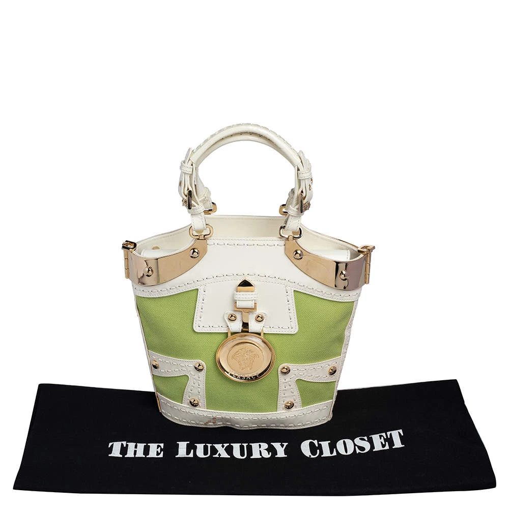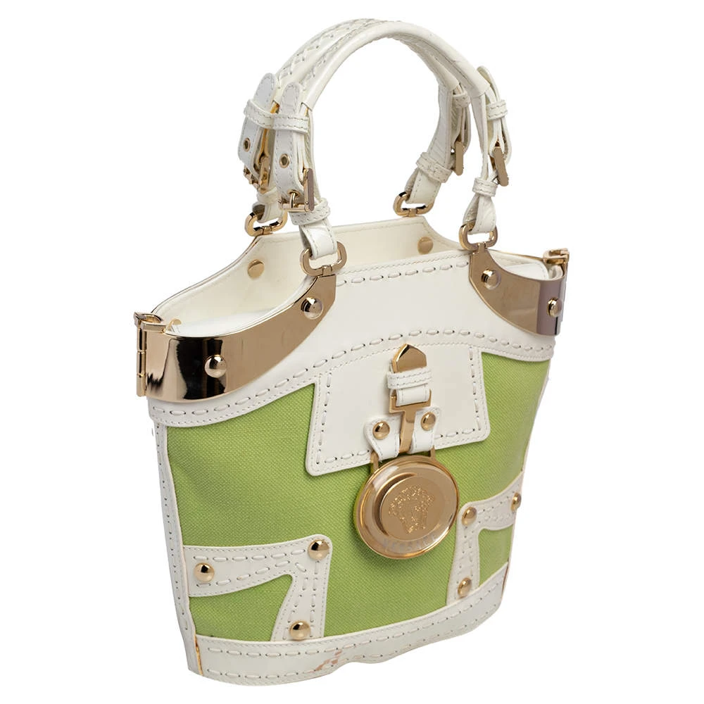 Attain a chic look when you carry this Versace tote in style. Crafted from green canvas and trimmed with patent leather as well as gold-tone metal, the bag is held by dual handles and is equipped with a spacious leather-lined interior. The creation features a Medusa-detailed padlock at the front.