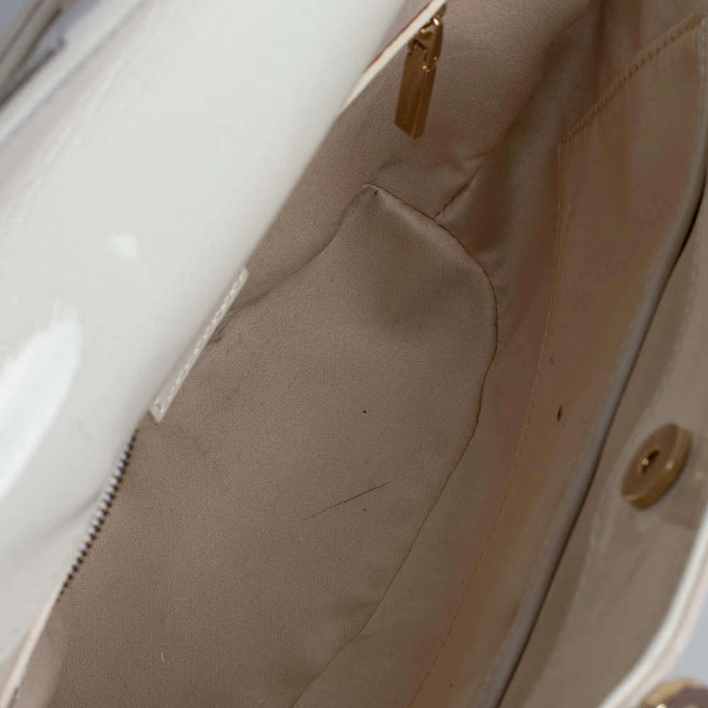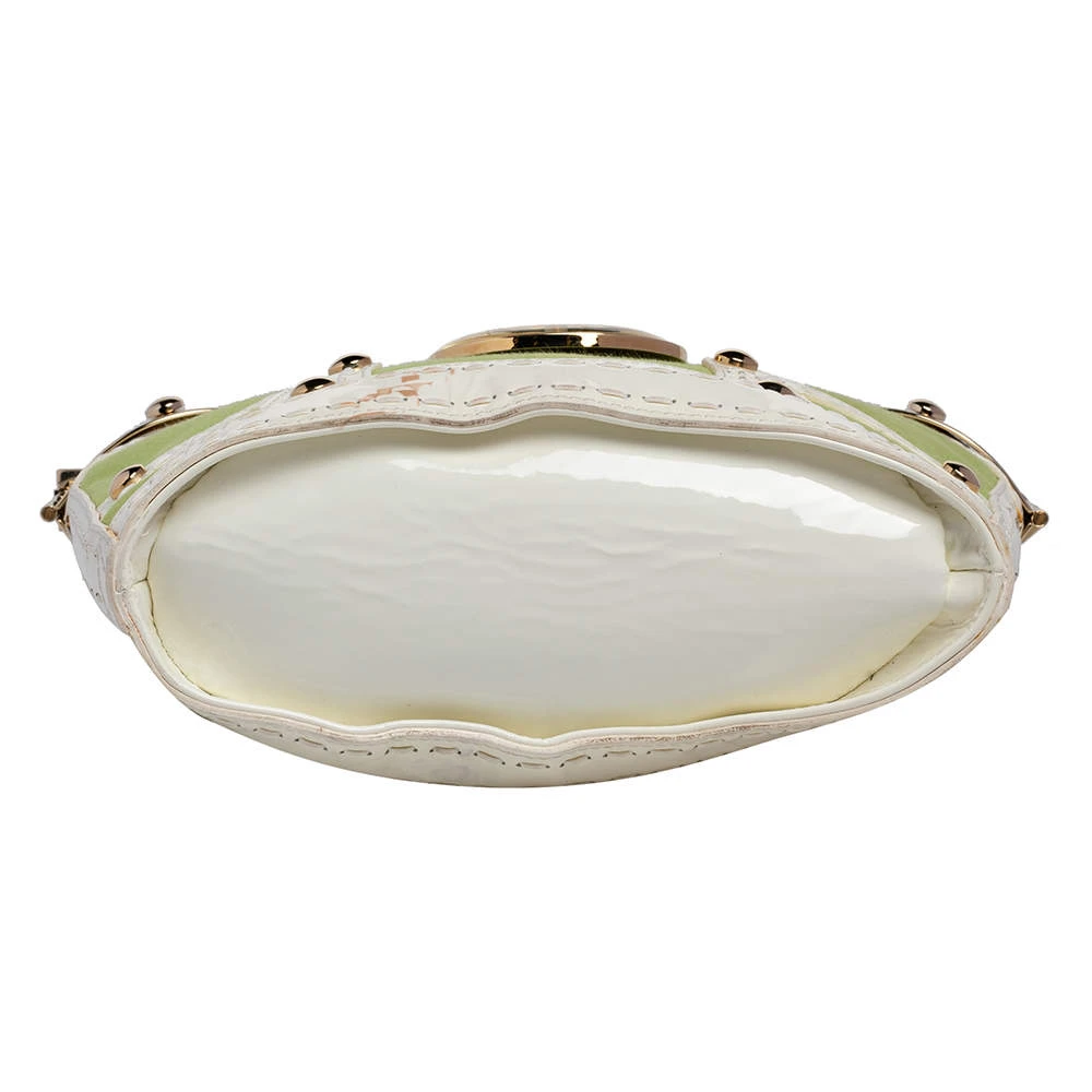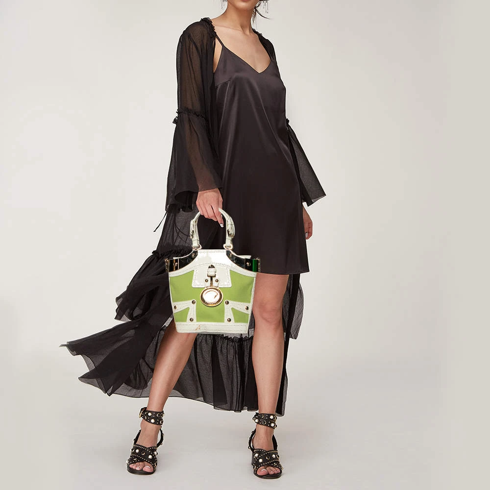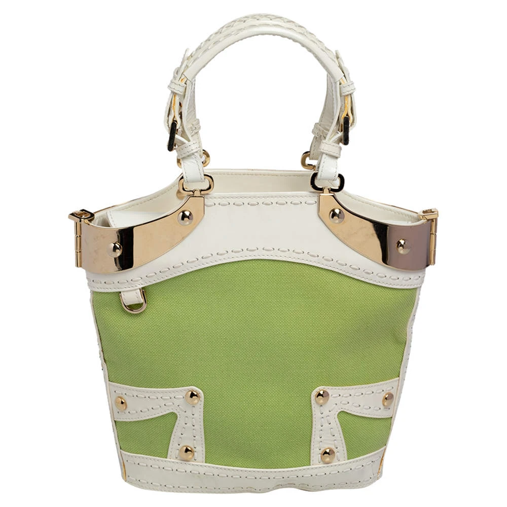 Attain a chic look when you carry this Versace tote in style. Crafted from green canvas and trimmed with patent leather as well as gold-tone metal, the bag is held by dual handles and is equipped with a spacious leather-lined interior. The creation features a Medusa-detailed padlock at the front.