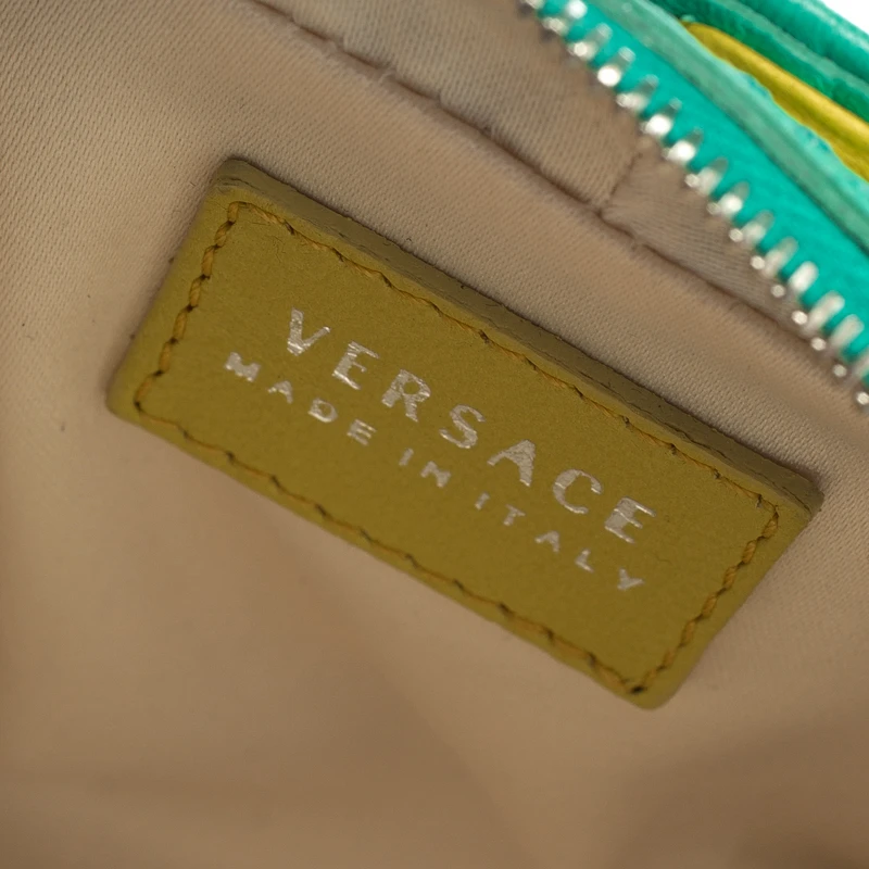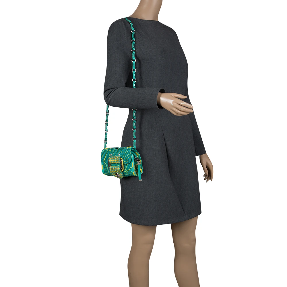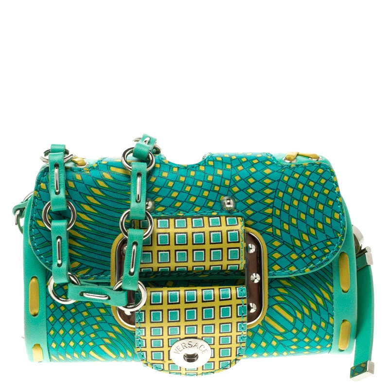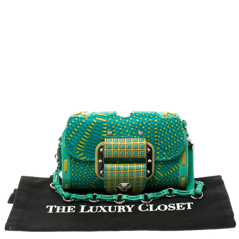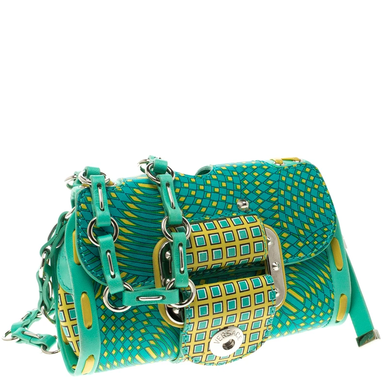 A perfect day and night wear party bag, this Versace crossbody piece is colourful and stylish which makes it a versatile piece to own. Crafted in green and yellow printed leather, this bag features a front flap with a silver tones buckle and strap detail to add a casual chic and modern vibe to its look. The green leather and chain link strap sits perfectly on your shoulders and even fits crossbody.