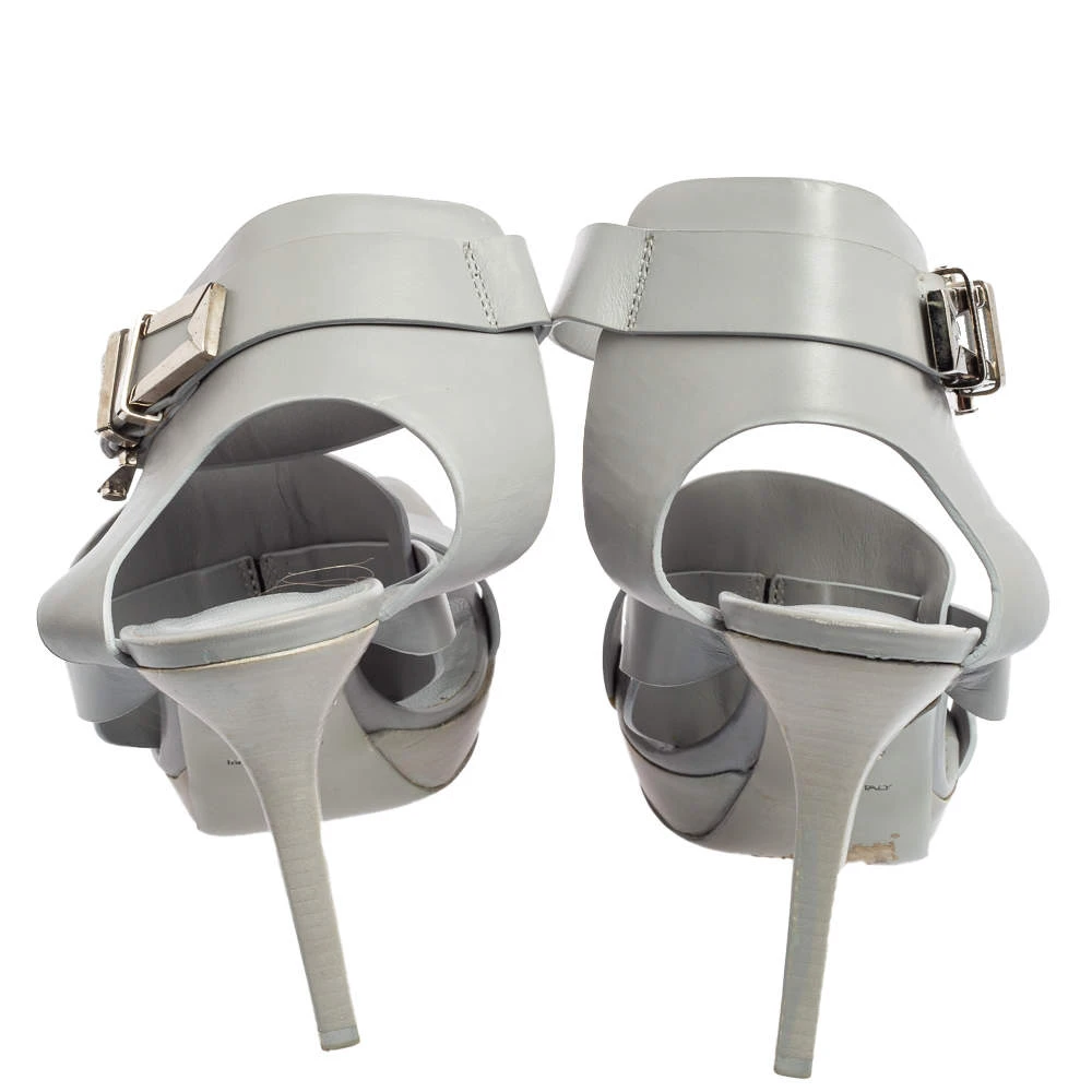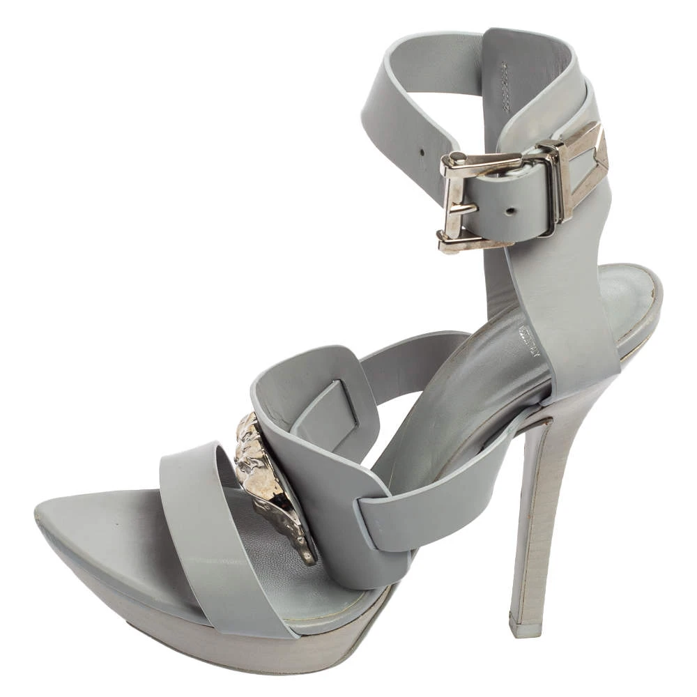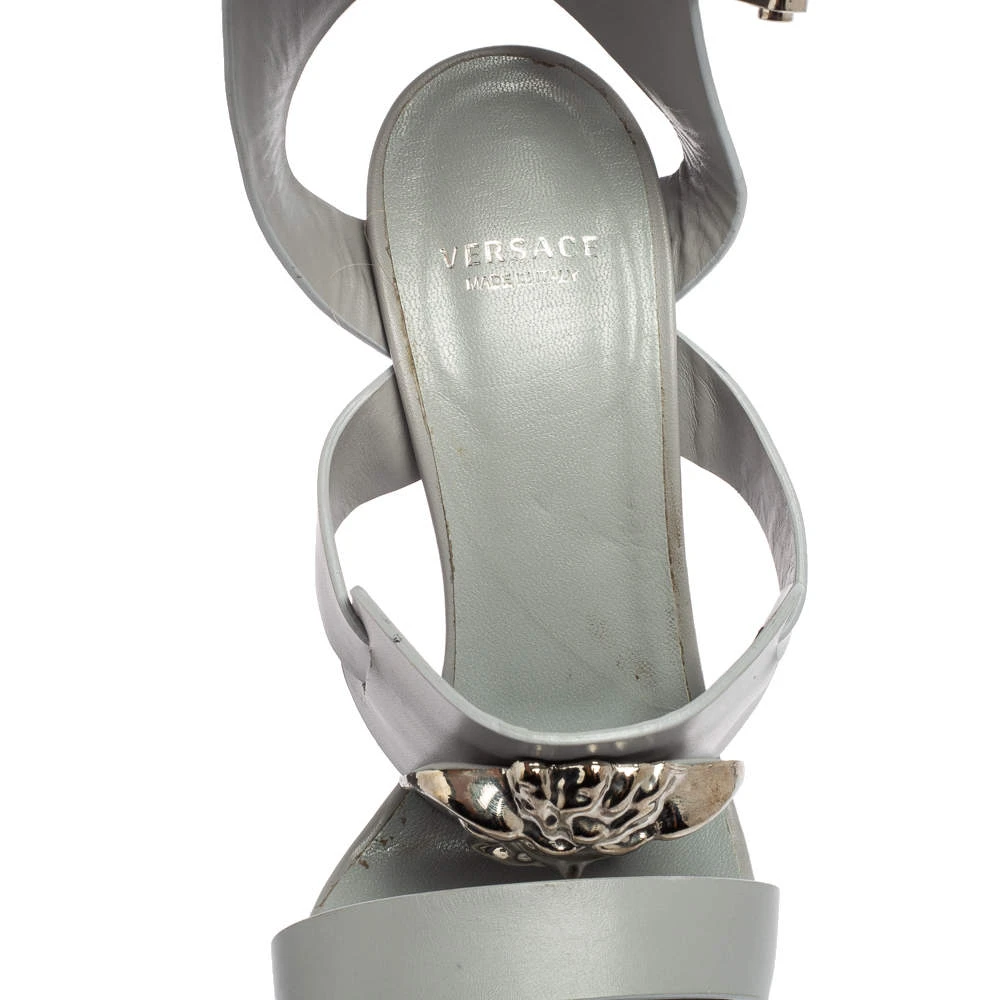 Define your feet with these pre-owned Versace sandals. The shoes are made of grey leather with open toes, Medusa motifs, and ankle buckle closure. Slim heels complement the design beautifully.