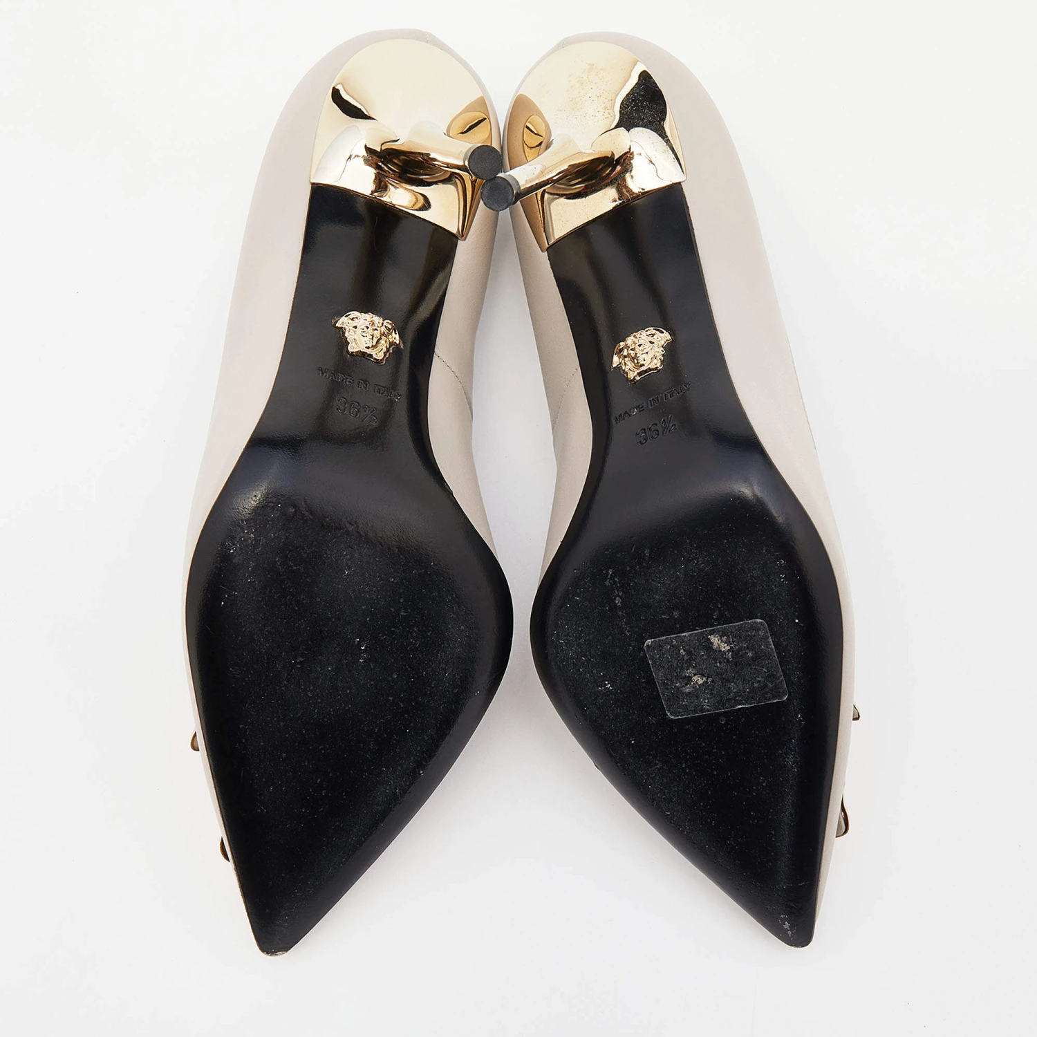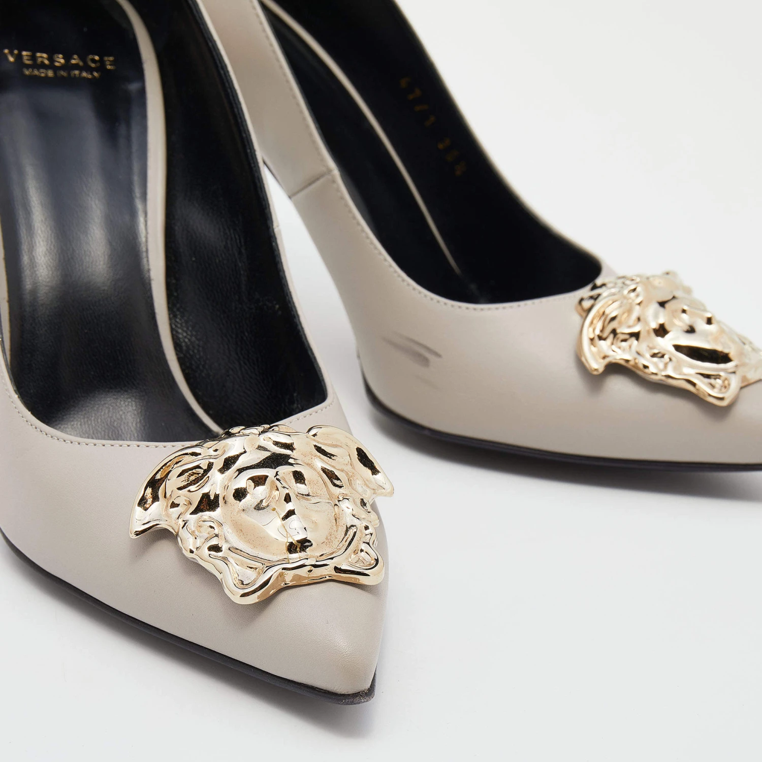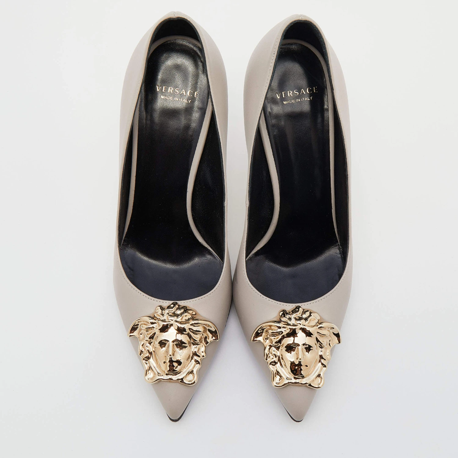 This pair of Versace pumps are a style statement with a timeless design. Crafted from grey leather, they feature pointed toes accented with the iconic Medusa motif in gold-tone metal, 9.5 cm heels and leather soles. They bring a touch of glamour to every outfit they are paired with.