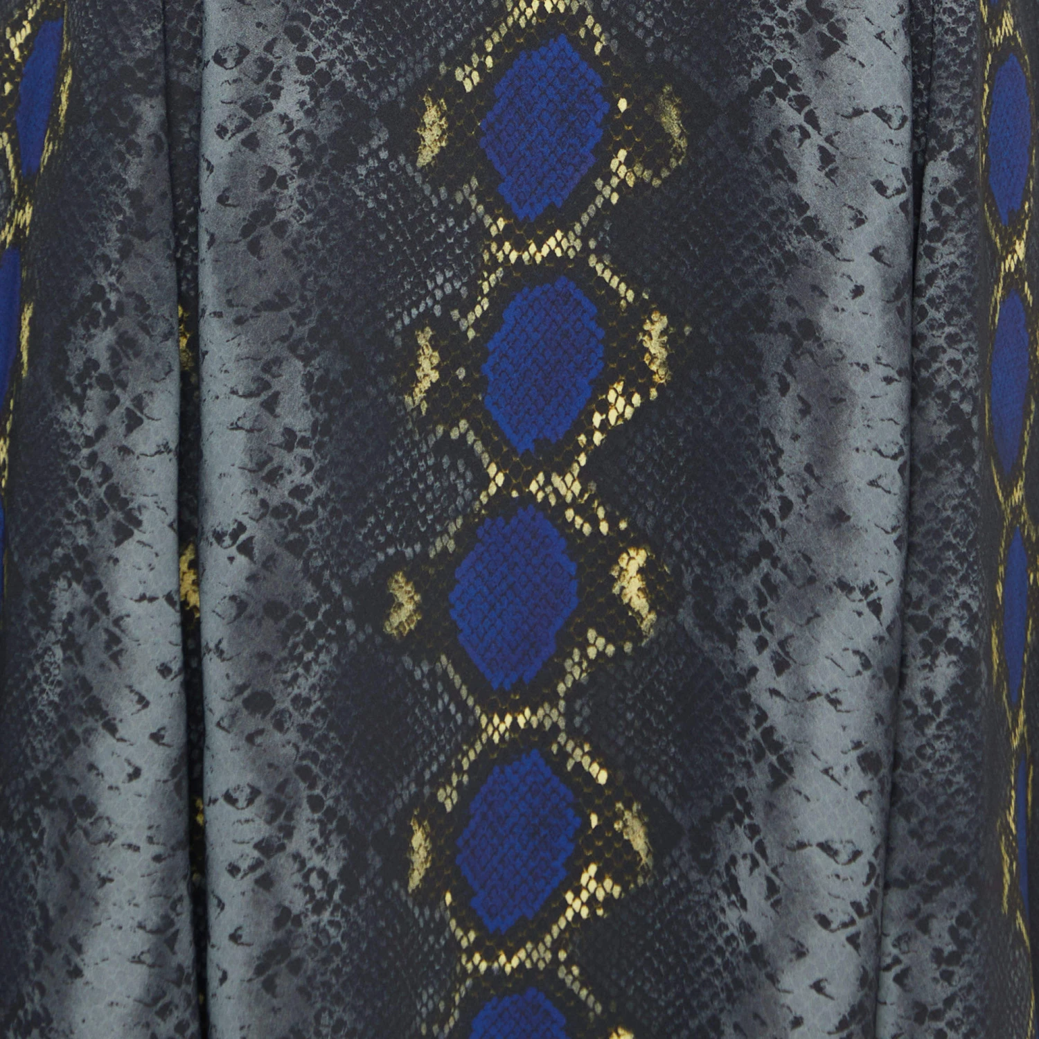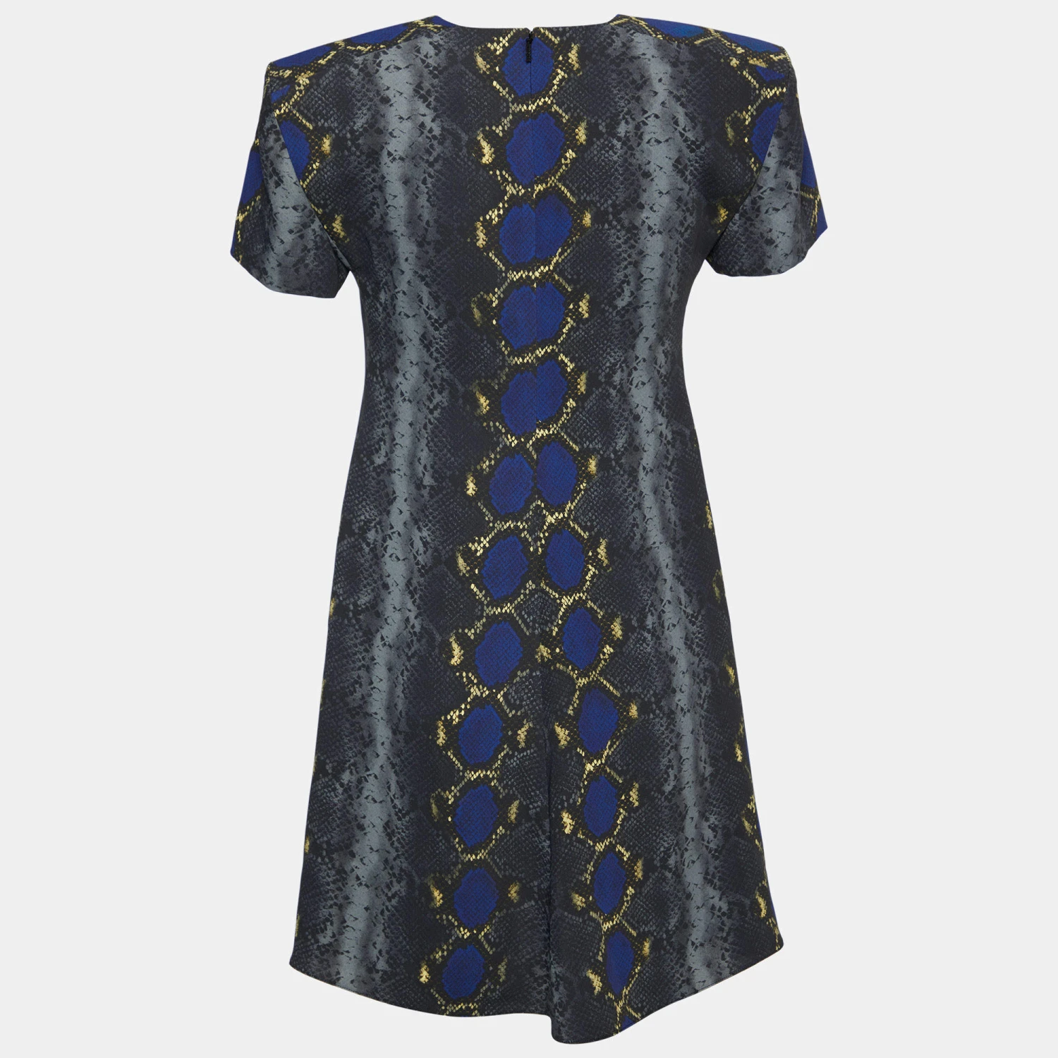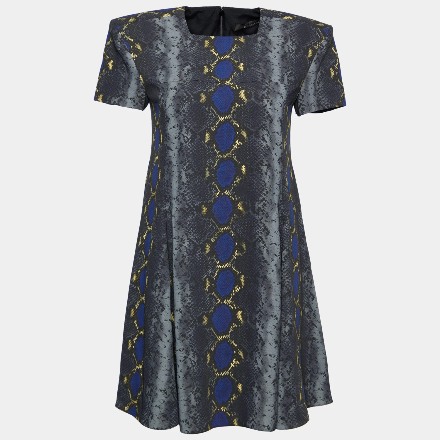 Feel the joy of luxury and dressing every time you wear this Versace creation. This grey mini dress is cut from crepe fabric, highlighted with multicolored snake prints, and finished with a squarish neck. It is made functional with two pockets. Style this Versace dress with tall sandals and a clutch to make an impressionable statement.