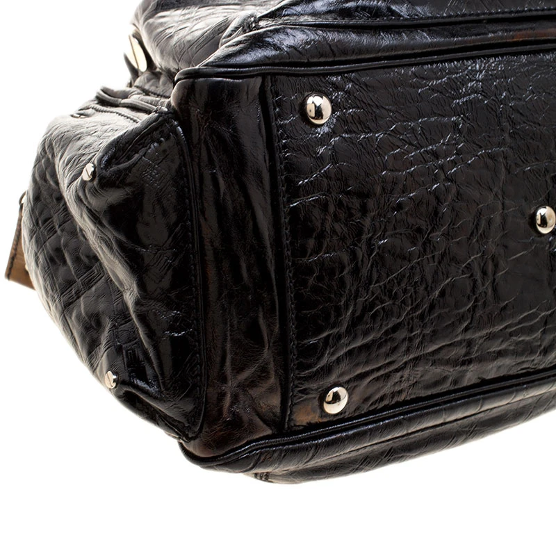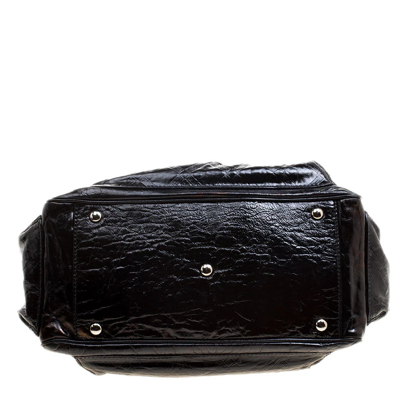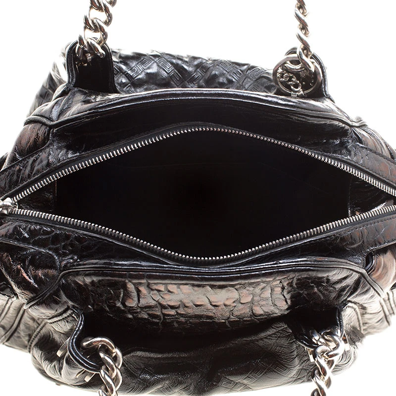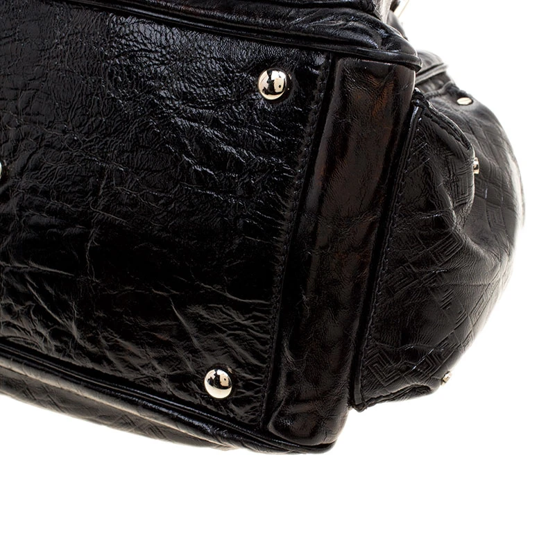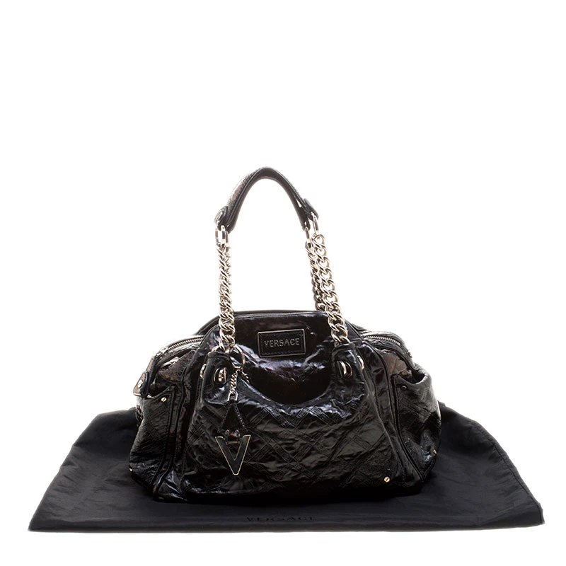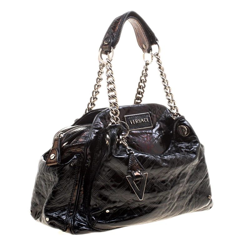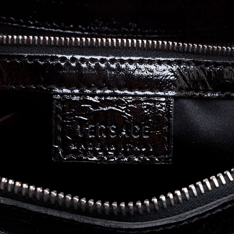 Crafted in black patent leather and accented with silver tone hardware details, this satchel from Versace is perfect for everyday and casual use to carry all your essentials with you. Featuring a quilted design on the surface and a V charm, this bag opens with a top zipper and is completed with two top chain handles for the effortless elegance.