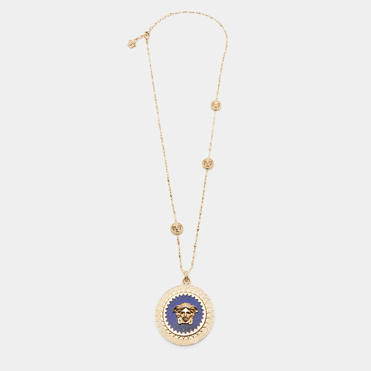Versace’s necklace is a pretty way to highlight your neckline for an evening out. The Medusa-encrusted Lapis Lazuli pendant comes with a gold-tone chain that is accentuated with dainty Medusa icons. For fastening, it comes with a lobster clasp. Make this stunning accessory yours soon!