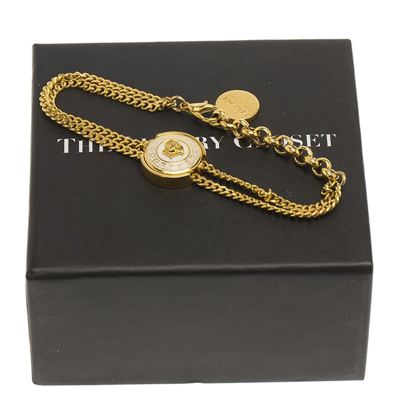 This Versace bracelet is a classic. Crafted from enamel and gold-tone metal, it features the iconic Medusa logo along with size adjustable loops. The chain linked bracelet comes with a lobster clasp closure.