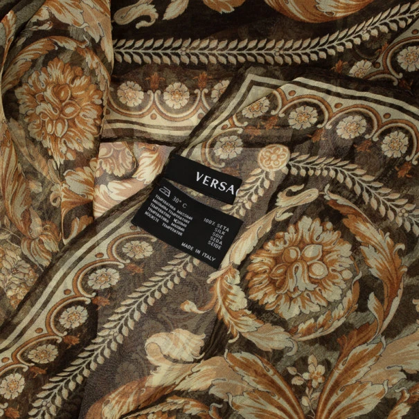 Add a touch of interest to a simple outfit with this Versace Leopard Print scarf. Made from 100% silk, it features dark green leopard print and golden designs along the edges.Original Retail Price: US $410
