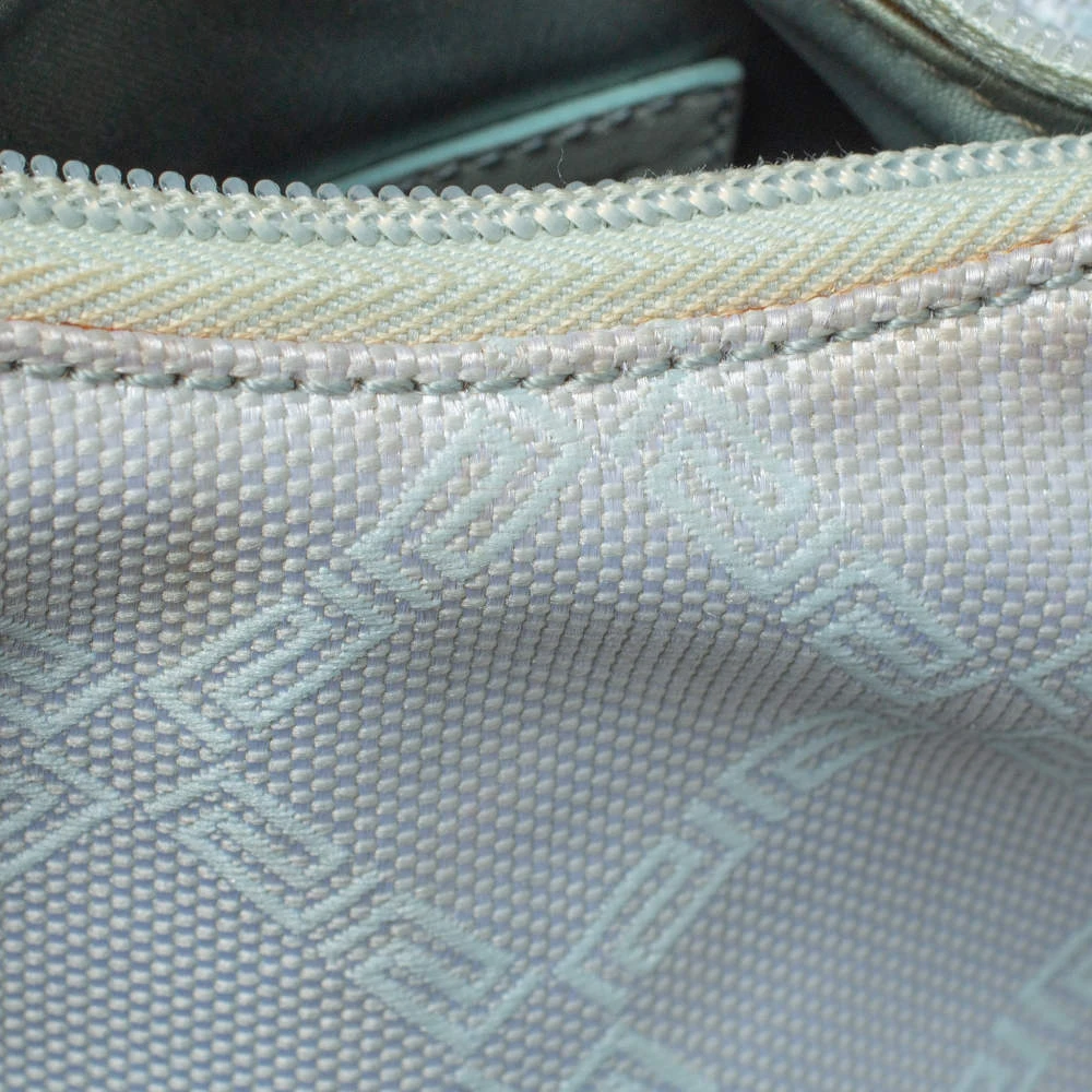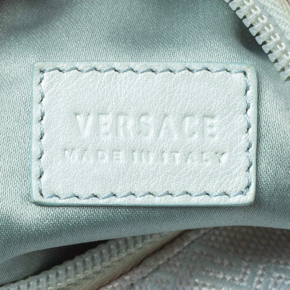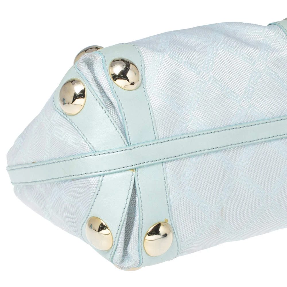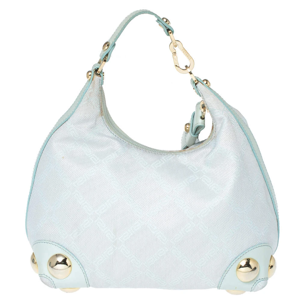 Stylish and perfect for day outings, this hobo bag by the house of Versace is a stunner. Crafted from signature canvas and leather, it comes in a lovely shade of light turquoise. It has a small silhouette, stud detailing, logo charm, single handle, fabric-lined interior and gold-tone hardware.
