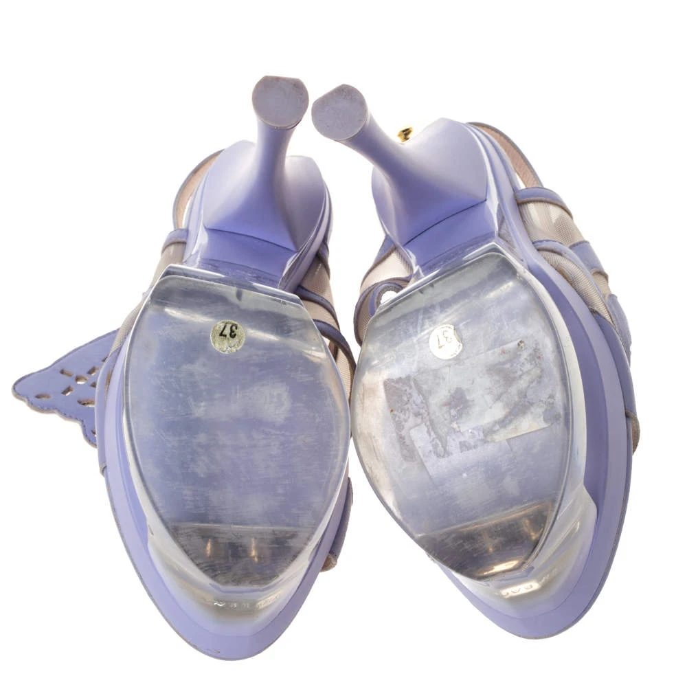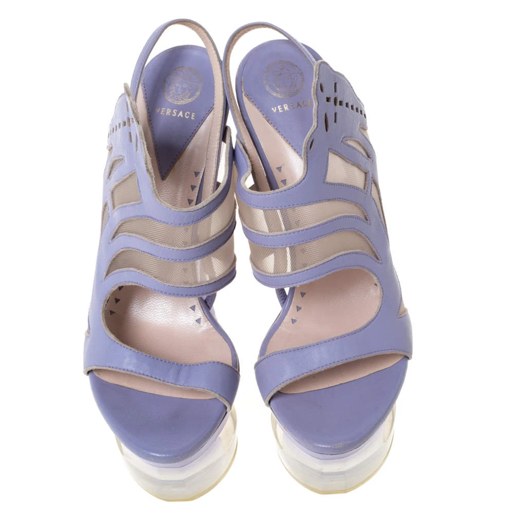 Exuding a feminine appeal, these Versace sandals are crafted in lilac leather and mesh in a beautiful silhouette. The pair is elevated with lucite platforms and towering stiletto heels. The slingback straps and leather lining ensures you walk with utmost comfort. Flaunt the pair with your A-line midi skirts and pantsuits.